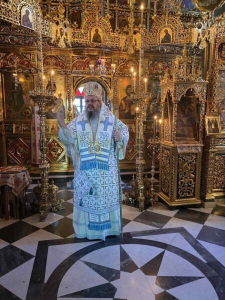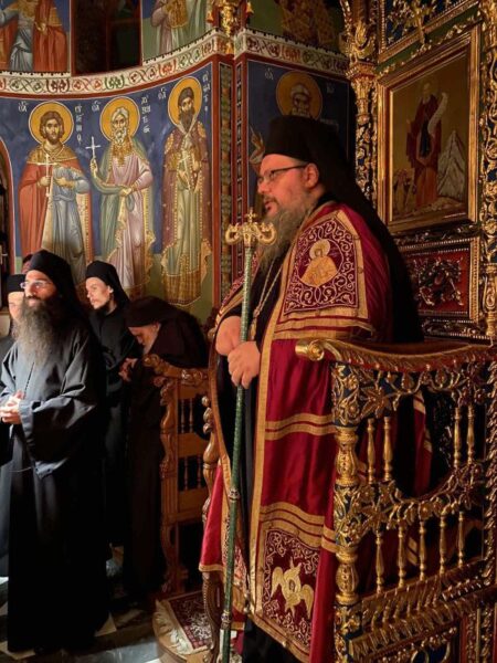 Απευθύνοντας λόγο κατά το πέρας της τραπέζης στους Πατέρες της Μονής και τους προσκυνητές επικεντρώθηκε στο Ευαγγέλιο της ημέρας λέγοντας ότι ο ίδιος ο Χριστός όταν ακούει να μακαρίζεται η Θεοτόκος μητέρα Του από μία γυναίκα του ακροατηρίου Του, επισημαίνει ότι μεγαλύτερη σημασία από τον θαυμασμό της αγιότητας έχει να επιθυμήσει ο άνθρωπος την ίδια την αγιότητα: “…μακάριοι οι ακούοντες τον λόγον του Θεού και φυλάσσοντες αυτόν.”