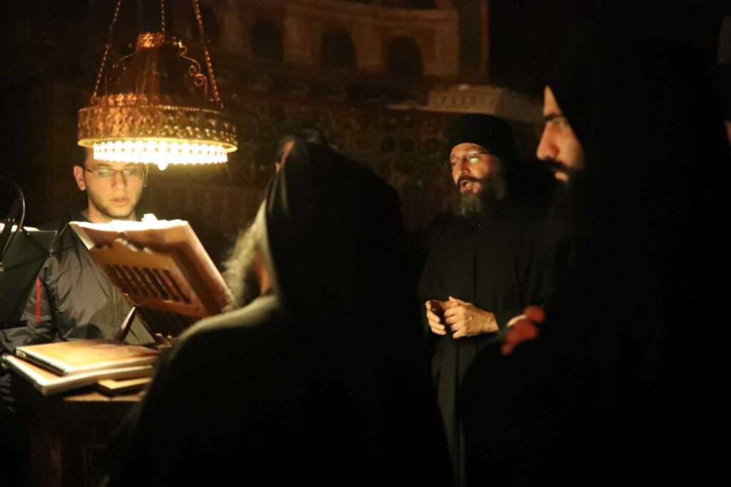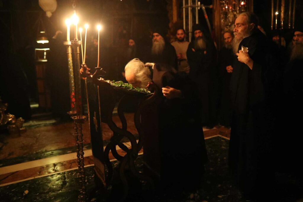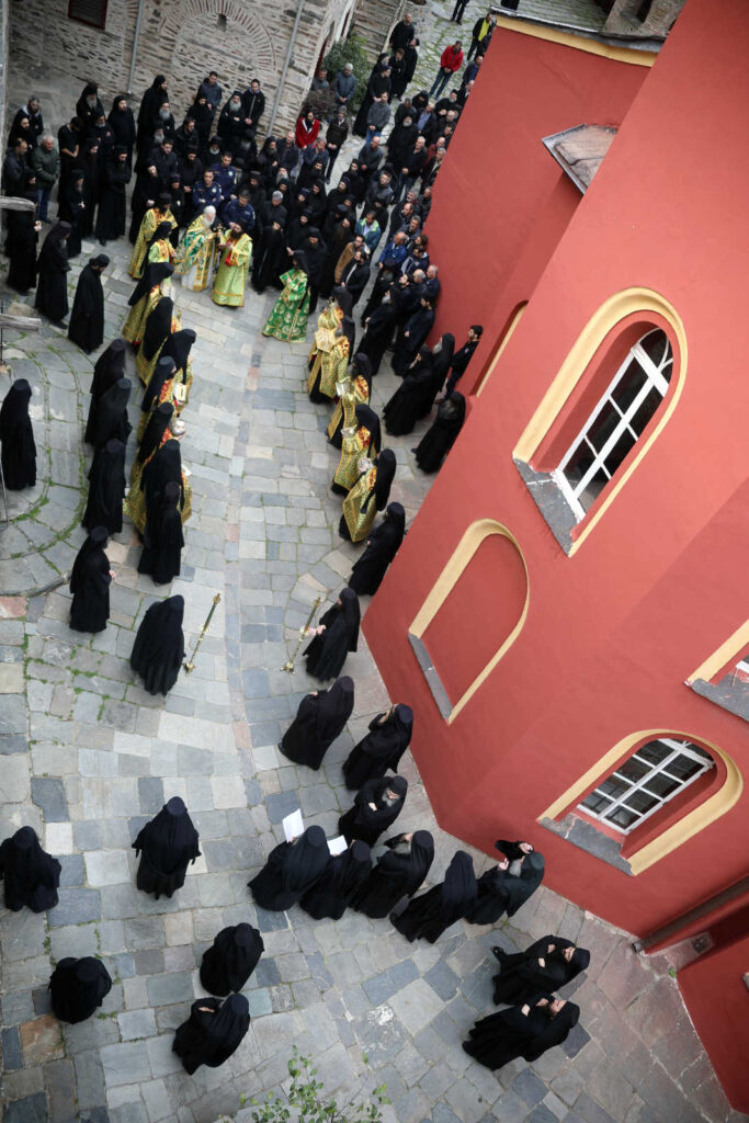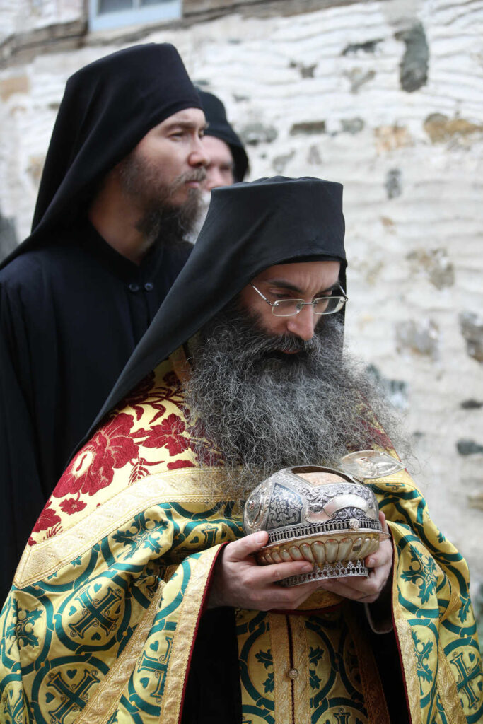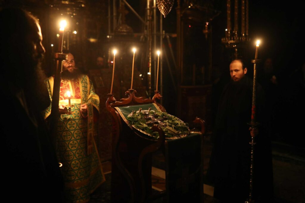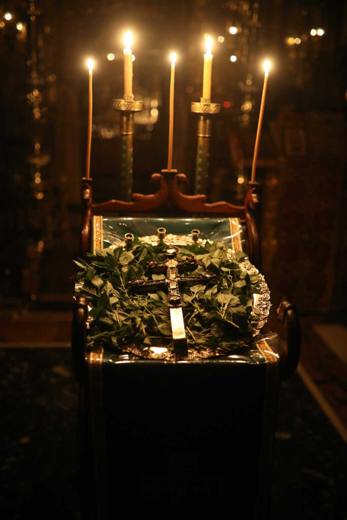 Στη συνέχεια ακολούθησε η ιερά λιτάνευση του Τιμίου Σταυρού και ιερών λειψάνων πέριξ του Καθολικού της Μονής, με τους πατέρες να ψάλλουν το απολυτίκιο της ημέρας.