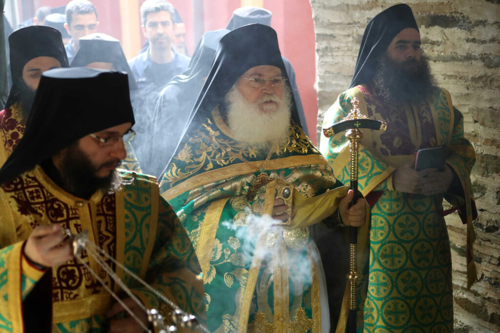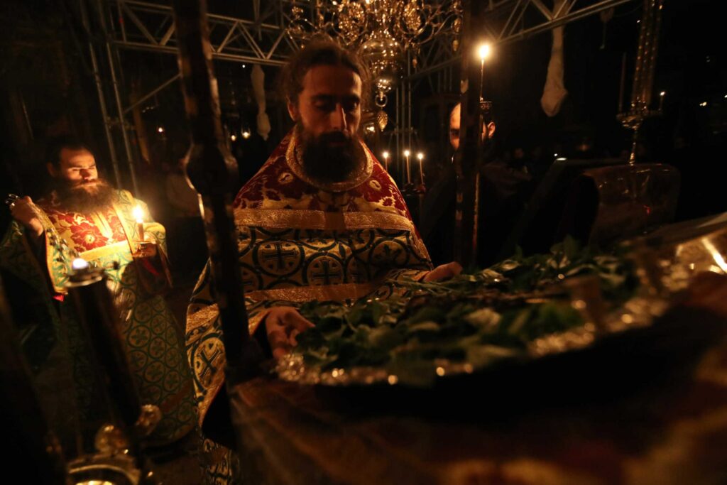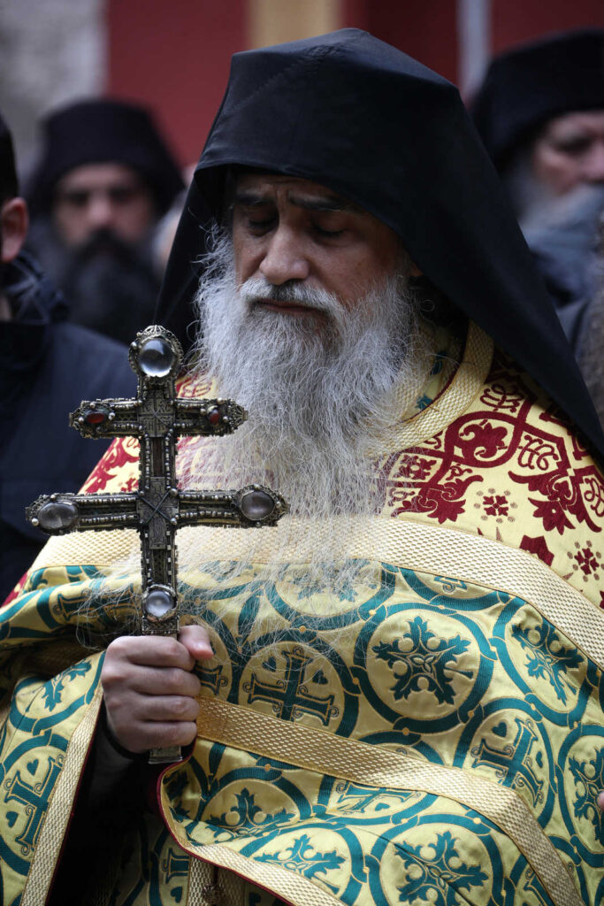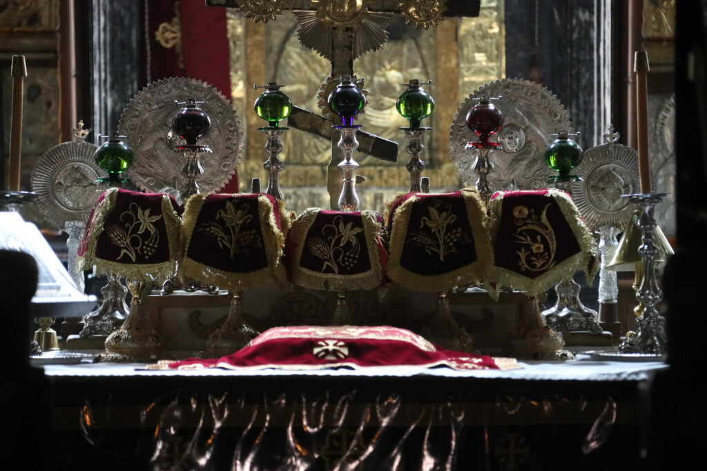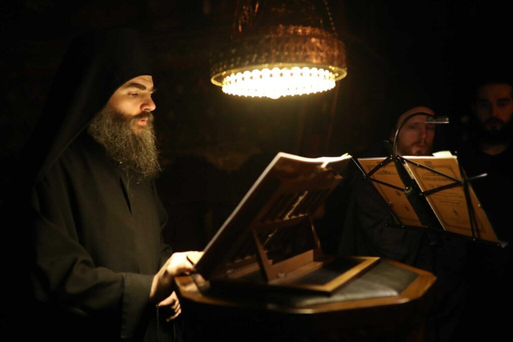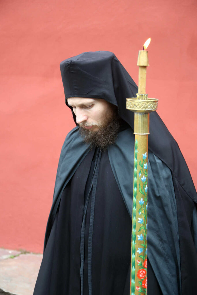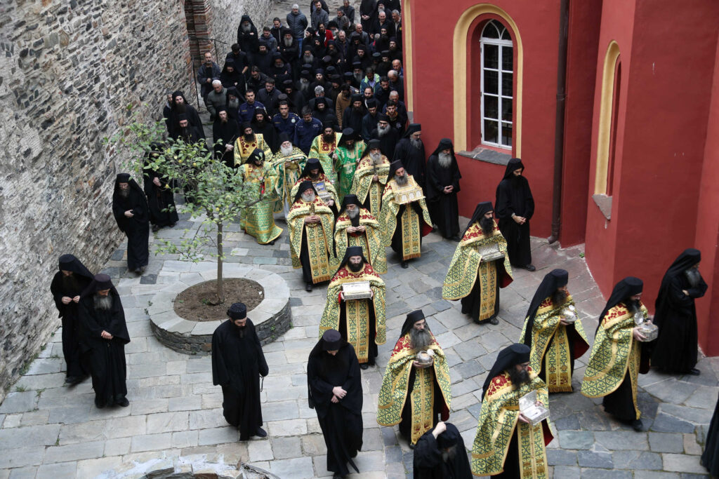 Στη συνέχεια ακολούθησε η ιερά λιτάνευση του Τιμίου Σταυρού και ιερών λειψάνων πέριξ του Καθολικού της Μονής, με τους πατέρες να ψάλλουν το απολυτίκιο της ημέρας.