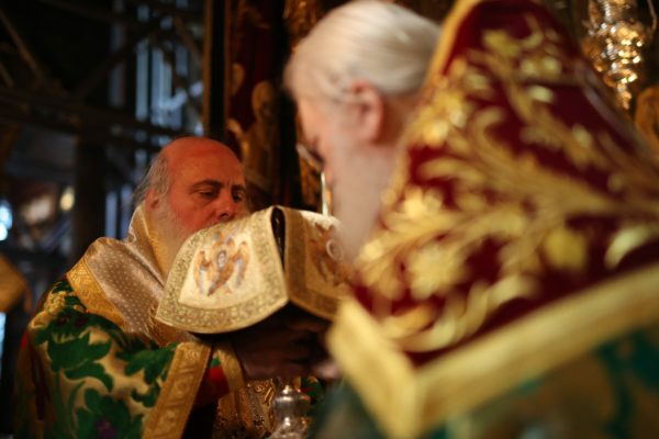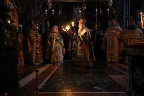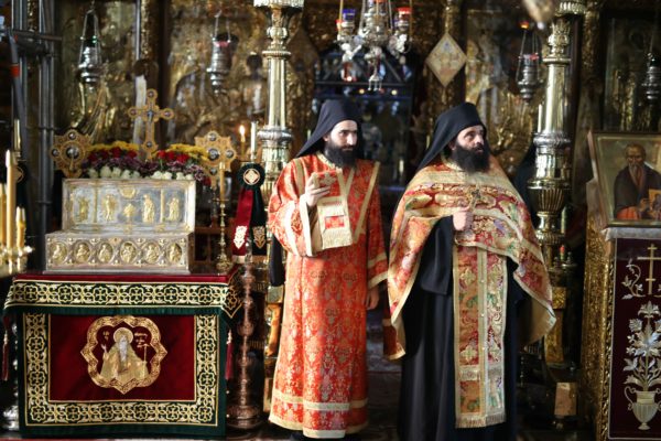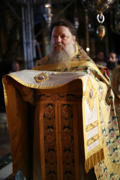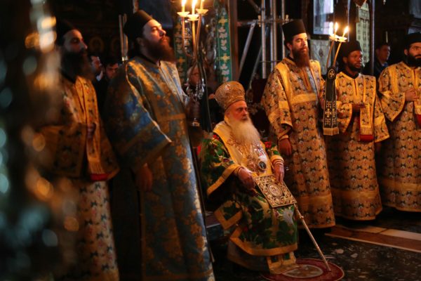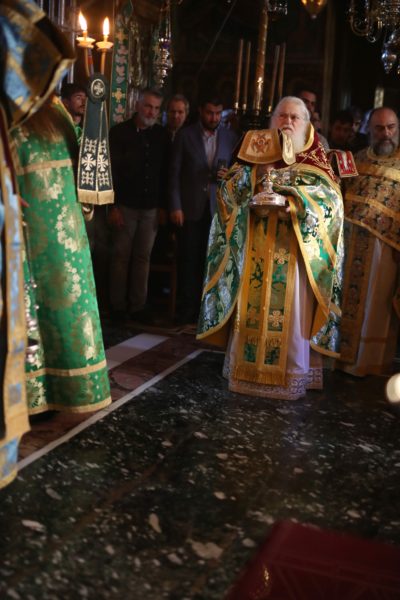 Μέχρι τις πρώτες πρωινές ώρες τελέσθηκε η Ιερά Αγρυπνία σύμφωνα με την αγιορείτικη τάξη. Μετά από ολιγόωρη διακοπή το πρωί τελέσθηκε η Αρχιερατική Θεία Λειτουργία, προεξάρχοντος του Μητροπολίτου Κινσάσας κ. Θεοδοσίου. Τον Σεβασμιώτατο πλαισίωναν ο Καθηγούμενος της Ιεράς Μεγίστης Μονής Βατοπαιδίου, Γέροντας Εφραίμ, Βατοπαιδινοί πατέρες και άλλοι Αγιορείτες πατέρες, ιερείς, ιερομόναχοι και διάκονοι.