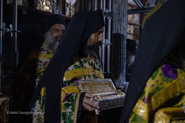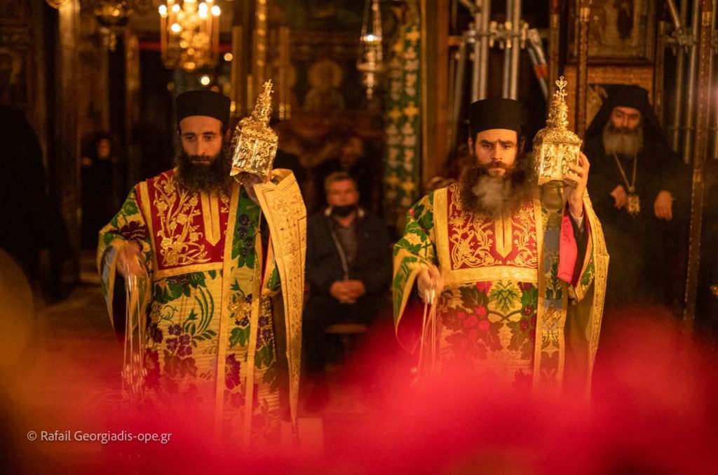 Χθες, μετά το πέρας της απογευματινής Τράπεζας οι καμπάνες ήχησαν, σημαίνοντας την έναρξη της πανηγυρικής Αγρυπνίας. Του Πανηγυρικού Αρχιερατικού Εσπερινού της Αγρυπνίας προεξήρχε ο Θεοφιλέστατος Επίσκοπος Λήδρας κ. Επιφάνιος πλαισιούμενος από τον Πανιερώτατο Μητροπολίτη Λεμεσού κ. Αθανάσιο, τον Θεοφιλέστατο Επίσκοπο Αμαθούντος κ. Νικόλαο, τον Πανοσιολογιώτατο Καθηγούμενο της Ιεράς Μεγίστης Μονής Βατοπαιδίου Γέροντα Εφραίμ, και τους Πανοσιολογιωτάτους Καθηγουμένους Αρχιμανδρίτη Παΐσιο της Ιεράς Μονής Τιμίου Προδρόμου Μέσα Ποταμού , Αρχιμανδρίτη Γενναδίου της Ιεράς Μονής Αρχαγγέλου Μιχαήλ στο Μονάγρι, Αρχιμανδρίτη Νείλου της Ιεράς Μονής Συμβούλου Χριστού , Βατοπαιδινούς Πατέρες και άλλους ιερείς, ιερομόναχους και διακόνους.
