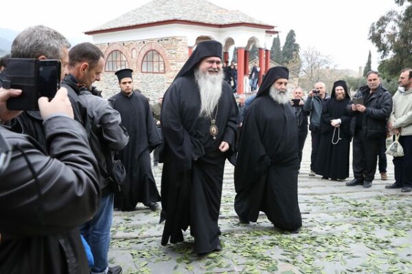 Η θερμή υποδοχή του Σεβασμιωτάτου Μητροπολίτου πραγματοποιήθηκε από τον Καθηγούμενο της Ιεράς Μονής Γέροντα Εφραίμ και την Βατοπαιδινή αδελφότητα αλλά και πλήθος κόσμου που περίμενε στον προαύλιο χώρο.
