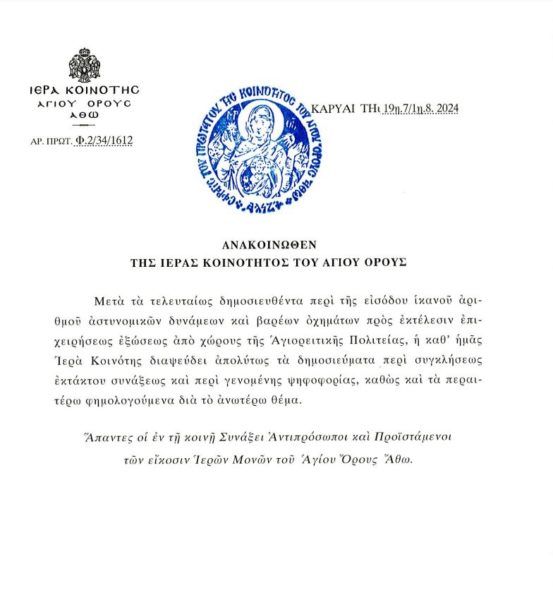 Διαψεύδει απολύτως τα δημοσιεύματα περί συγκλήσεως εκτάκτου συνάξεως και περί γενομένης ψηφοφορίας η Ιερά Κοινότητα του Αγίου Όρους σχετικά με την είσοδο ικανού αριθμού αστυνομικών δυνάμεων και βαρέων οχημάτων προς επιτέλεση επιχείρησης έξωσης από τον χώρο της Αγιορειτικής Πολιτείας.