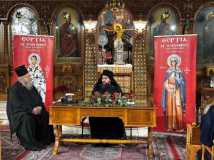 Ακολούθως έλαβε τον λόγο ο π. Γεννάδιος, ο οποίος εξέφρασε την δοξολογία του στον Θεό για την δυνατότητα να βρίσκεται στον Ιερό Ναό του Αγίου Ελευθερίου και ευχήθηκε στον εορτάζοντα π. Θεμιστοκλή να είναι πλούσιοι οι καρποί στην οικογένειά του αλλά και σ’ αυτόν τον αμπελώνα, όπου τον έθεσε ο Κύριος να ποιμαίνη τις ψυχές των ανθρώπων. Ευχαρίστησε τον Γέροντα Εφραίμ που επέτρεψε την εδώ παρουσία του καθώς και τον Μακαριώτατο, ο οποίος έδωσε την σχετική άδεια.