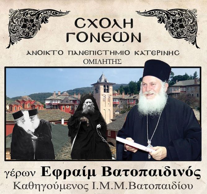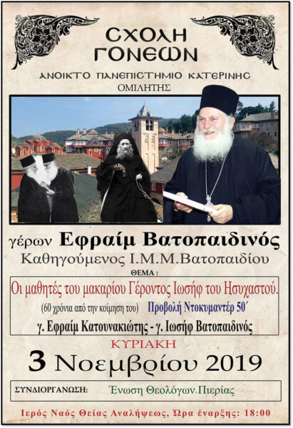 Την Κυριακή 3 Νοεμβρίου 2019, στον Ι.Ν. Θείας Αναλήψεως Κατερίνης, στις 18:00, ο Γέροντας Εφραίμ Βατοπαιδινός θα μιλήσει με θέμα: «Οι μαθητές του μακαρίου γέροντος Ιωσήφ του ησυχαστού» με αφορμή τα 60 χρόνια από την κοίμηση του και την πρόσφατη αγγελία του Πατριάρχη Κωνσταντινουπόλεως για την Αγιοκατάταξη του γ. Ιωσήφ Ησυχαστού και παπά Εφραίμ Κατουνακιώτη.
