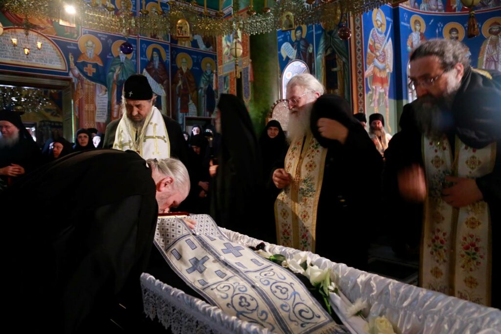 Ο εκπρόσωπος του Οικουμενικού Πατριάρχου Μητροπολίτης Μιλήτου κ. Απόστολος διάβασε το Πατριαρχικό γράμμα. Στη συνέχεια ο Γέρων Πρόδρομος, Καθηγούμενος της Ιεράς Μονής Μεγίστης Λαύρας, εκφώνησε επικήδειο λόγο, εκπροσωπώντας την Αγιορειτική Μοναστική Πολιτεία. Ακολούθως μίλησε ο Γέρων Βασίλειος Γοντικάκης, Προηγούμενος της Ιεράς Μονής Ιβήρων σκιαγραφώντας με θερμά λόγια το έργο και τη παρακαταθήκη που αφήνει ο μακαριστός Γέροντας. Τέλος το πνευματικό τέκνο και διάδοχός του Γέρων Ελισαίος Σιμωνοπετρίτης συγκινημένος και ένδακρυς κατευόδωσε τον μακαριστό Γέροντα του. Αυτή την ώρα οι αρχιερείς, ο κλήρος, οι μοναχοί και οι μοναχές, καθώς και πλήθος κόσμου προσκύνησαν το σκήνωμα του μακαριστού Γέροντα, λαμβάνοντας για τελευταία φορά την ευχή του. Στη συνέχεια θα γίνει περιφορά του σκηνώματος στον περίβολο της Μονής και ακολούθως θα ταφεί στο περιστύλιο έξω από το Καθολικό.