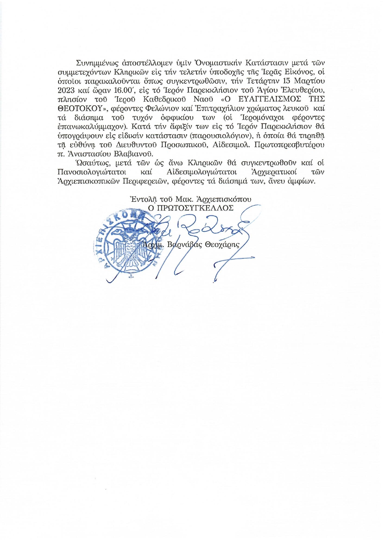 Συνημμένως ἀποστέλλομεν ὑμῖν Ὀνομαστικήν Κατάστασιν μετά τῶν συμμετεχόντων Κληρικῶν εἰς τήν τελετήν ὑποδοχῆς τῆς Ἱερᾶς Εἰκόνος, οἱ ὁποῖοι παρακαλοῦνται ὅπως συγκεντρωθῶσιν, τήν Τετάρτην 15 Μαρτίου 2023 καί ὥραν 16.00΄, εἰς τό Ἱερόν Παρεκκλήσιον τοῦ Ἁγίου Ελευθερίου, πλησίον τοῦ Ἱεροῦ Καθεδρικοῦ Ναοῦ «Ο ΕΥΑΓΓΕΛΙΣΜΟΣ ΤΗΣ ΘΕΟΤΟΚΟΥ», φέροντες Φελώνιον καί Ἐπιτραχήλιον χρώματος λευκοῦ καί τα διάσημα τοῦ τυχόν ὀφφικίου των (οἱ Ἱερομόναχοι φέροντες ἐπανωκαλύμμαχον). Κατά τήν ἄφιξίν των εἰς τό Ἱερόν Παρεκκλήσιον θά ὑπογράψουν εἰς εἰδικήν κατάστασιν (παρουσιολόγιον), ἡ ὁποία θα τηρηθῇ τῇ εὐθύνῃ τοῦ Διευθυντοῦ Προσωπικοῦ, Αἰδεσιμολ. Πρωτοπρεσβυτέρου π. Ἀναστασίου Βλαβιανοῦ. Ὡσαύτως, μετά τῶν ὡς ἄνω Κληρικῶν θά συγκεντρωθοῦν καί οἱ Πανοσιολογιώτατοι και Αἰδεσιμολογιώτατοι Ἀρχιερατικοί Ἀρχιεπισκοπικῶν Περιφερειῶν, φέροντες τά διάσημά των, ἄνευ ἀμφίων. τῶν Τ Ἐντολῇ τοῦ Μακ. Ἀρχιεπισκόπου.