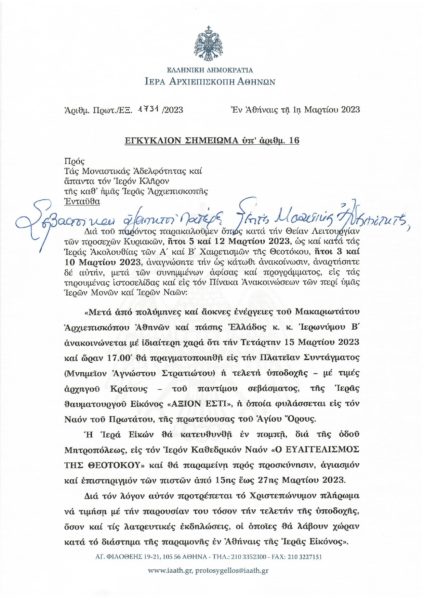 Τη σχετική εγκύκλιο εξέδωσε την 1η Μαρτίου η Αρχιεπισκοπή Αθηνών έχει αριθμό 16 και απευθύνεται στις Ιερές Μονές και στους Κληρικούς της Αρχιεπισκοπής Αθηνών.