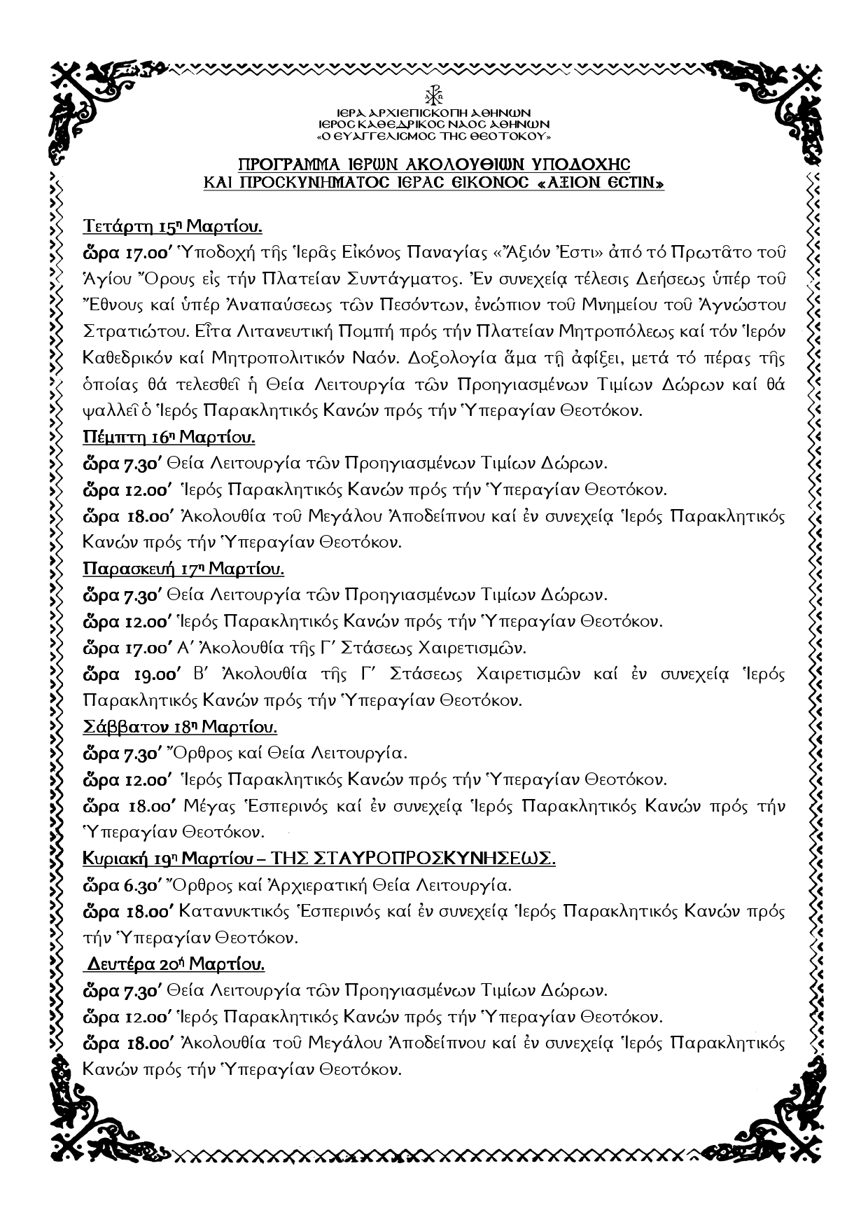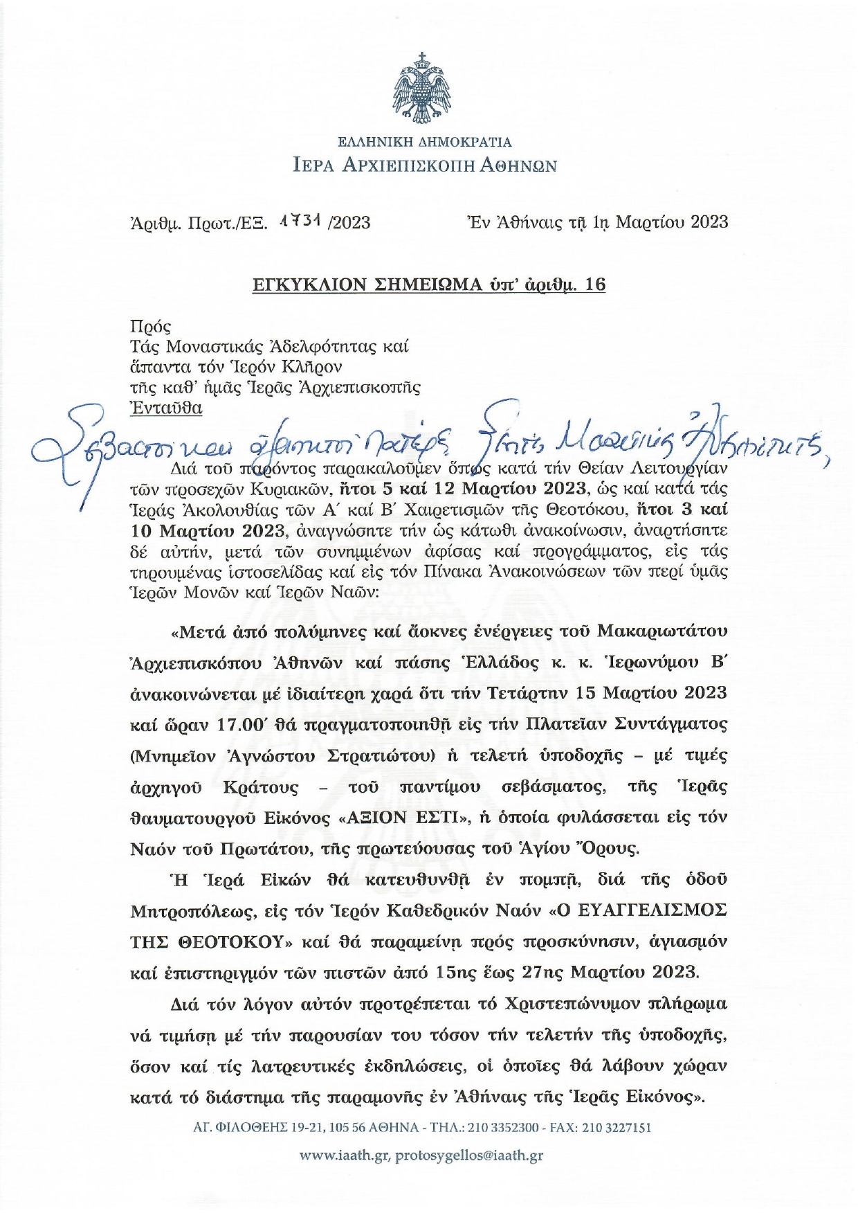 …Διά τοῦ παρόντος παρακαλοῦμεν ὅπως κατά τήν Θείαν Λειτουργίαν τῶν προσεχῶν Κυριακῶν, ἤτοι 5 και 12 Μαρτίου 2023, ὡς καί κατά τάς Ἱεράς Ἀκολουθίας τῶν Α΄ καί Β΄ Χαιρετισμῶν τῆς Θεοτόκου, ἤτοι 3 καί 10 Μαρτίου 2023, ἀναγνώσητε τήν ὡς κάτωθι ἀνακοίνωσιν, ἀναρτήσητε δέ αὐτήν, μετά τῶν συνημμένων ἀφίσας και προγράμματος, εἰς τάς τηρουμένας ἱστοσελίδας καί εἰς τόν Πίνακα Ἀνακοινώσεων τῶν περί ὑμᾶς Ἱερῶν Μονῶν καί Ἱερῶν Ναῶν: «Μετά ἀπό πολύμηνες καί ἄοκνες ἐνέργειες τοῦ Μακαριωτάτου Αρχιεπισκόπου Ἀθηνῶν καί πάσης Ἑλλάδος κ. κ. Ιερωνύμου Β΄ ἀνακοινώνεται με ιδιαίτερη χαρά ὅτι τήν Τετάρτην 15 Μαρτίου 2023 καί ὥραν 17.00΄ θα πραγματοποιηθῇ εἰς τήν Πλατεῖαν Συντάγματος (Μνημεῖον Αγνώστου Στρατιώτου) ή τελετή ὑποδοχῆς μέ τιμές ἀρχηγοῦ Κράτους τοῦ παντίμου σεβάσματος, τῆς Ἱερᾶς] θαυματουργοῦ Εἰκόνος «ΑΞΙΟΝ ΕΣΤΙ», ἡ ὁποία φυλάσσεται εἰς τόν Ναόν τοῦ Πρωτάτου, τῆς πρωτεύουσας τοῦ Ἁγίου Ὄρους. Ἡ Ἱερά Εϊκών θά κατευθυνθῇ ἐν πομπῇ, διά τῆς ὁδοῦ Μητροπόλεως, εἰς τόν Ἱερόν Καθεδρικόν Ναόν «Ο ΕΥΑΓΓΕΛΙΣΜΟΣ ΤΗΣ ΘΕΟΤΟΚΟΥ» και θα παραμείνη πρός προσκύνησιν, ἁγιασμόν καί ἐπιστηριγμόν τῶν πιστῶν ἀπό 15ης ἕως 27ης Μαρτίου 2023. Διά τόν λόγον αὐτόν προτρέπεται τό Χριστεπώνυμον πλήρωμα νά τιμήσῃ μέ τήν παρουσίαν του τόσον τήν τελετήν τῆς ὑποδοχής, ὅσον καί τίς λατρευτικές εκδηλώσεις, οἱ ὁποῖες θά λάβουν χώραν κατά το διάστημα τῆς παραμονῆς ἐν Ἀθήναις τῆς Ἱερᾶς Εἰκόνος».