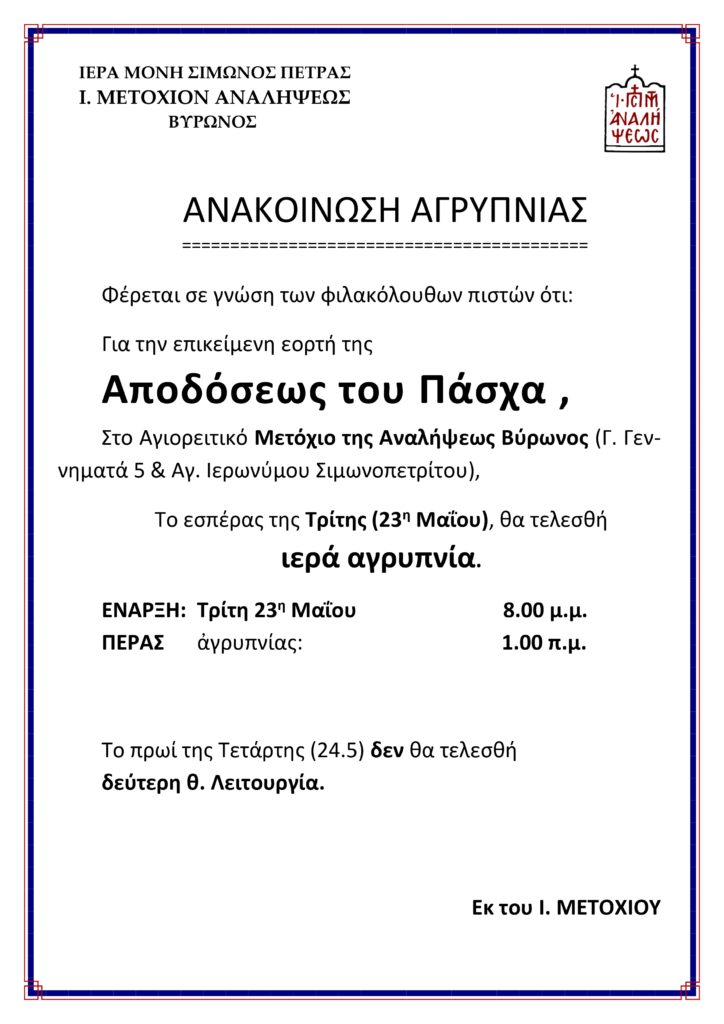 Για την επικείμενη εορτή της Αποδόσεως του Πάσχα, στο Αγιορειτικό Μετόχιο της Αναλήψεως Βύρωνος (Γ. Γεννηματά 5 & Αγ. Ιερωνύμου Σιμωνοπετρίτου), το απόγευμα της της Τρίτης 23 Μαΐου, θα τελεσθεί Ιερά Αγρυπνία.