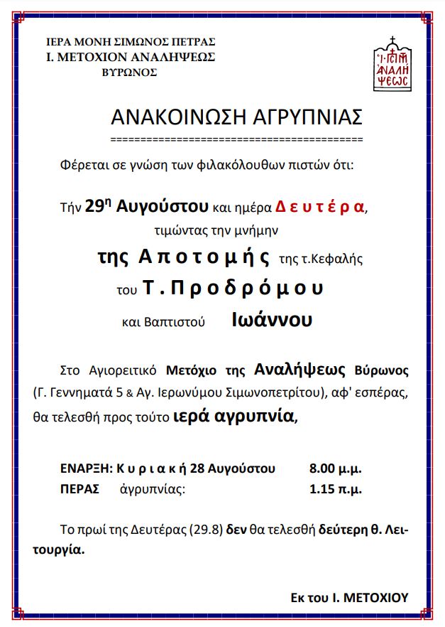 Στο Αγιορειτικό Μετόχιο της Αναλήψεως Βύρωνος (Γ. Γεννηματά 5 & Αγ. Ιερωνύμου Σιμωνοπετρίτου), αφ’ εσπέρας, θα τελεσθή προς τούτο ιερά αγρυπνία,
