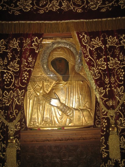 Η παράδοση διασώζει ότι κατά την περίοδο της εικονομαχίας, κάποιος ασκητής την μετέφερε στην Κύπρο για να την γλυτώσει από την καταστροφή, και συγκεκριμένα σε μια σπηλιά στα βουνά του Μαχαιρά, όπου παρέμεινε και ο ίδιος μέχρι το τέλος της ζωής του. Μετά τον θάνατό του έμεινε εκεί ξεχασμένη για πολλούς αιώνες.