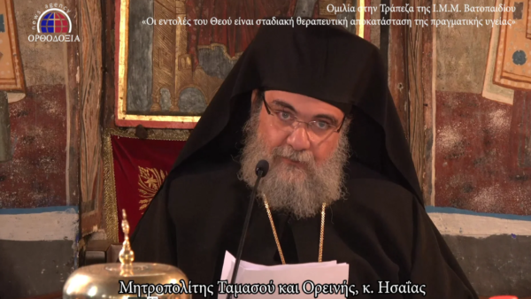 Ο Πανιερώτατος Μητροπολίτης Ταμασού και Ορεινής κ. Ησαΐας μιλώντας στην Τράπεζα της Ι. Μ. Μ. Βατοπαιδίου, κατά την εορτή του αγίου Παντελεήμονος του Ιαματικού, απευθυνόμενος στους Πατέρες της Μονής και μιλώντας για τον βίο και τη δράση του αγίου Παντελεήμονος αναφέρθηκε στη σημασία της παρουσίας των Αγίων στη ζωή του ανθρώπου, στο υπόδειγμα που Άγιοι αφήνουν με την μαρτυρία τους και το μαρτύριο τους προς τον άνθρωπο, καθώς με την επιλογή τους να πολεμήσουν τα πάθη και να καλλιεργήσουν τις αρετές αξιώθηκαν της αγιότητας, η οποία είναι ο σκοπός και προορισμός του ανθρώπου.