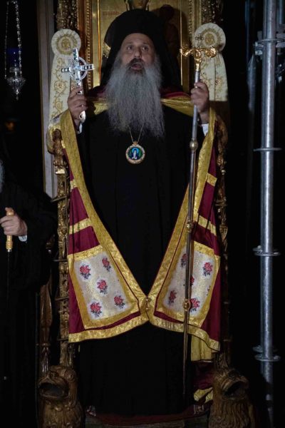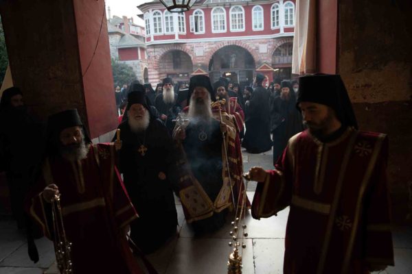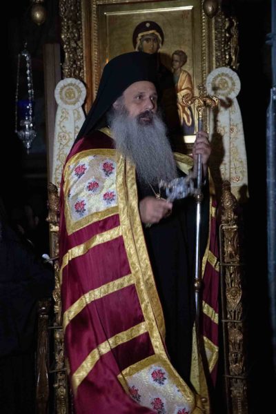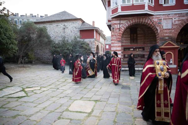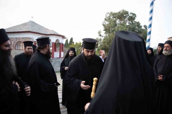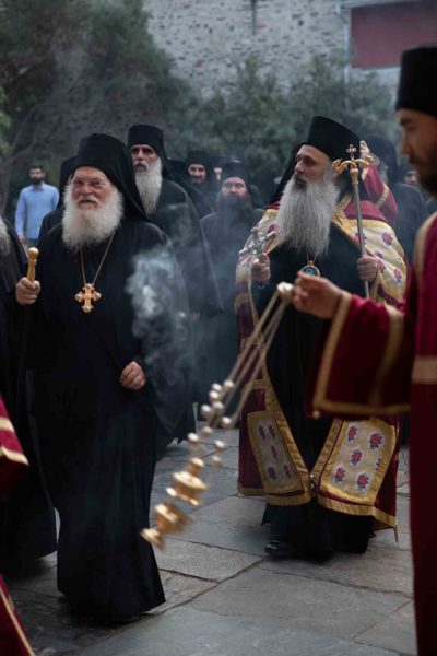 Τον Μητροπολίτη υποδέχθηκαν στην πύλη της Μονής ο Καθηγούμενος Γέρων Εφραίμ Βατοπαιδινός και η Αδερφότητα της Μονής, εν συνεχεία εν πομπή προσήλθαν στο Καθολικό της Μονής όπου εψάλλει δέηση σύμφωνα με το αγιορείτικο τυπικό.