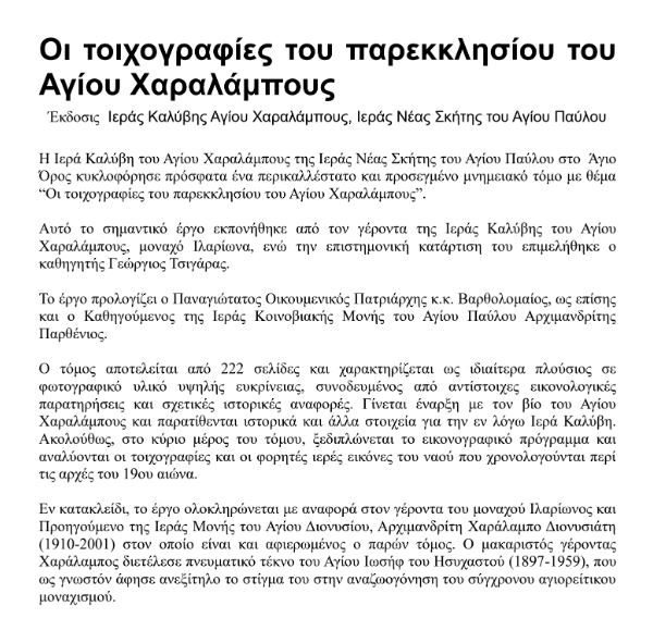 Εκδόθηκε εκ μέρους του Γέροντος Ιλαρίωνος μοναχού της Ιεράς Καλύβης του Αγίου Χαραλάμπους, Ιεράς Νέας Σκήτης του Αγίου Όρους, ο νέος τόμος με τίτλο “Οι τοιχογραφίες του παρεκκλησίου του Αγίου Χαραλάμπους”. Παραθέτουμε εικόνες και περιγραφή απο την Έκδοση: