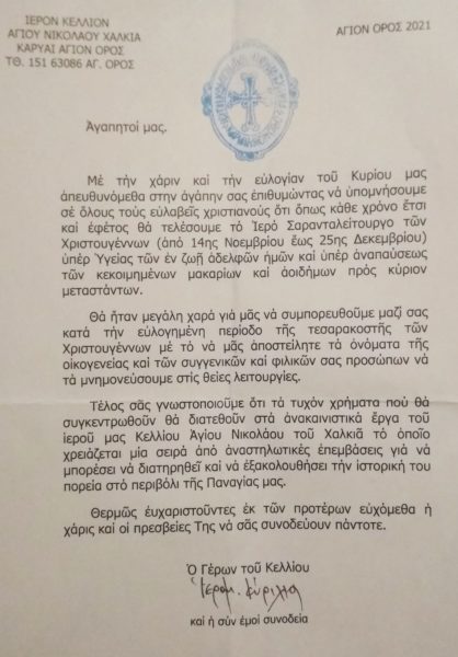Ευχαριστούν θερμά εκ των προτέρων όποιον θελήσει να στείλει ονόματα -πολλώ δε μάλλον και οικονομική βοήθεια- και εύχονται η χάρη και οι πρεσβείες της Παναγίας να μας συνοδεύουν πάντοτε.