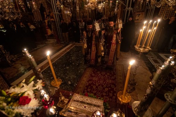 Μετά το πέρας της υποδοχής του Καθηγουμένου της Ι.Μ. Σταυρονικήτα, η Τίμια Ζώνη εξήλθε από το Ιερό Βήμα για την πανηγυρική αγρυπνία από τον Γέροντα Τύχωνα, παρουσία του Καθηγουμένου της Ιεράς Μεγίστης Μονής Βατοπαιδίου Γέροντα Εφραίμ, ιερέων, ιερομονάχων και διακόνων.