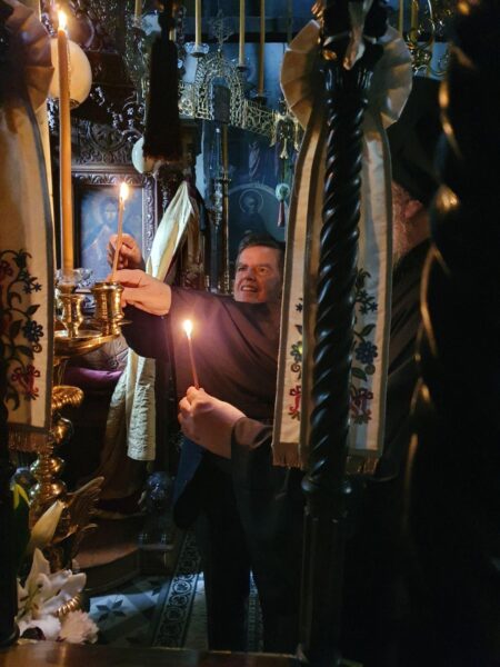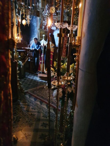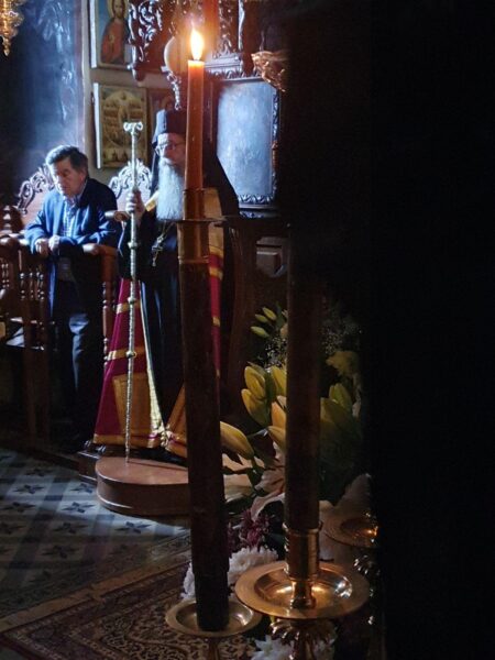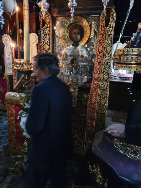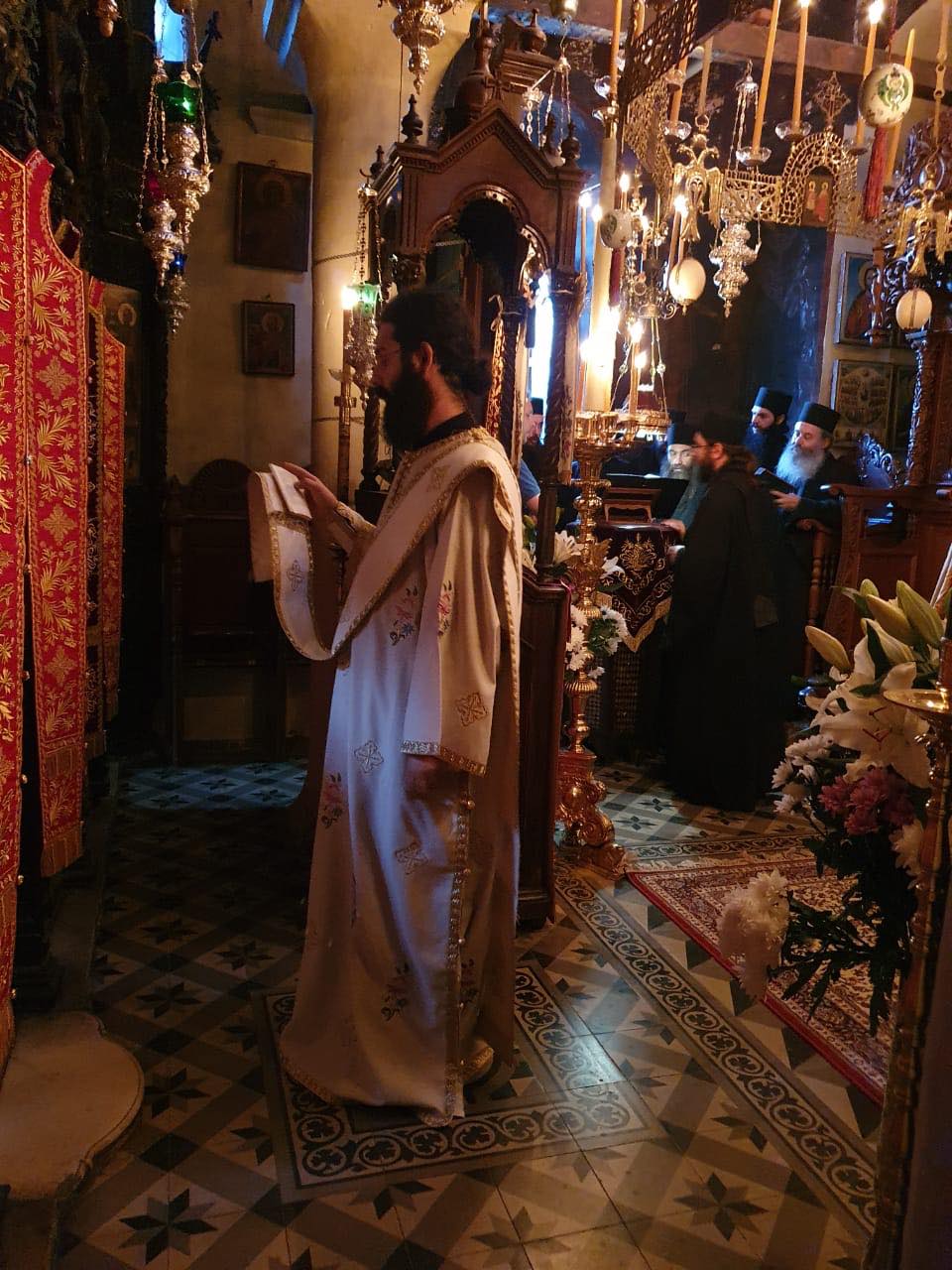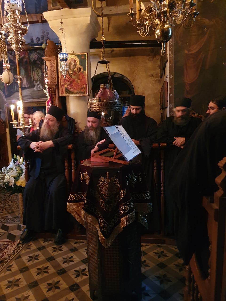 Αριστερά ψάλλει η Συνοδεία Γ. Γρηγορίου Μαθητού Αγ. Παϊσίου, του Ιερού Κελλίου του Αγ. Ιωάννου Θεολόγο της Ιεράς Μονής Κουτλουμουσίου
