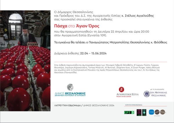 Η Αγιορειτική Εστία συμμετέχει στις εκδηλώσεις της «Λατρευτικής Εβδομάδας» του Δήμου Θεσσαλονίκης, με την διοργάνωση της ομαδικής έκθεσης φωτογραφίας και ιερών κειμηλίων με τίτλο: «Πάσχα στο Άγιον Όρος», στην οποία παρουσιάζεται φωτογραφικό υλικό με θέμα τη Μεγάλη Εβδομάδα και το Πάσχα στην Αθωνική Πολιτεία.