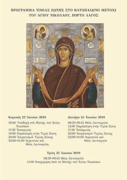 Πρόγραμμα Τιμίας Ζώνης στο Βατοπαιδινό Μετόχι στο Πόρτο Λάγος