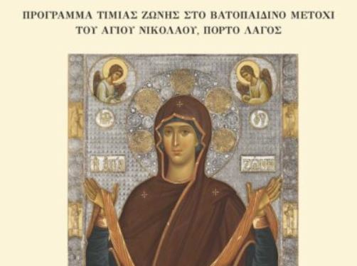 Ακολουθεί το αναλυτικό πρόγραμμα από την παραμονή της Τιμίας Ζώνης στο Βατοπαιδινό Μετόχι του Αγίου Νικολάο, Πόρτο Λάγος.