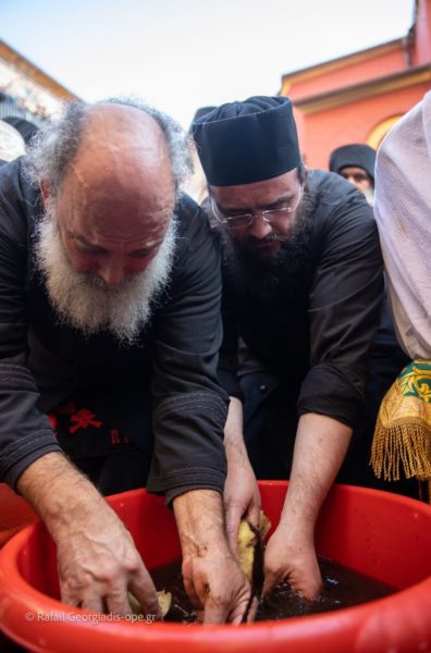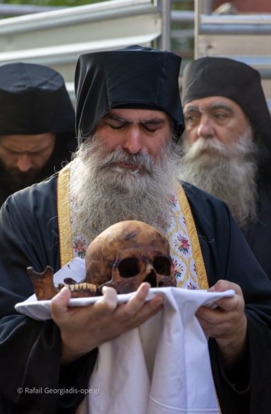 Εν συνεχεία, ενώ ψαλλόταν ένας αργός ύμνος από την χορωδία της Μονής, αποκαλύφτηκε ο τάφος και φάνηκαν τα οστά, τα οποία ένα ένα με προσοχή οι αδελφοί ανέβασαν από τον τάφο και τοποθέτησαν σε πρόχειρα σε πανέρι μέχρι να γίνει το καθιερωμένο πλύσιμο με κρασί.