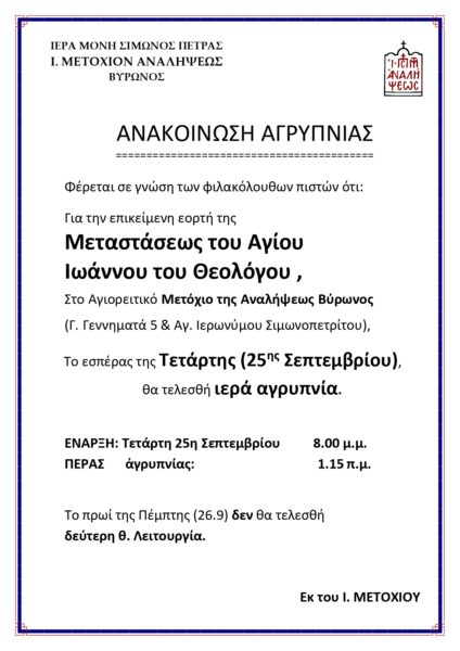 Αγρυπνία θα τελεσθεί στο Σιμωνοπετρίτικο Μετόχι της Αναλήψεως στο Βύρωνα, για την εορτή της Μετάστασης του Αγίου Ιωάννη του Θεολόγου στις 25 Σεπτεμβρίου 2024.