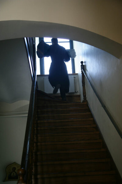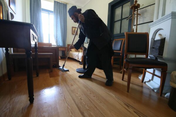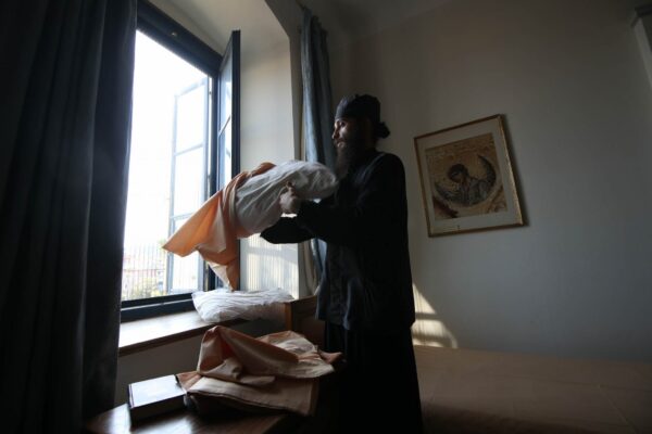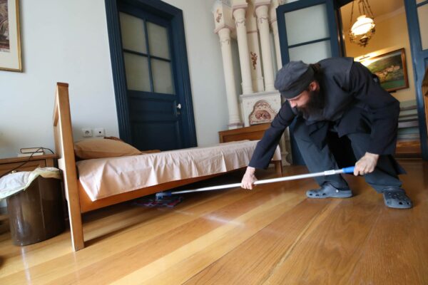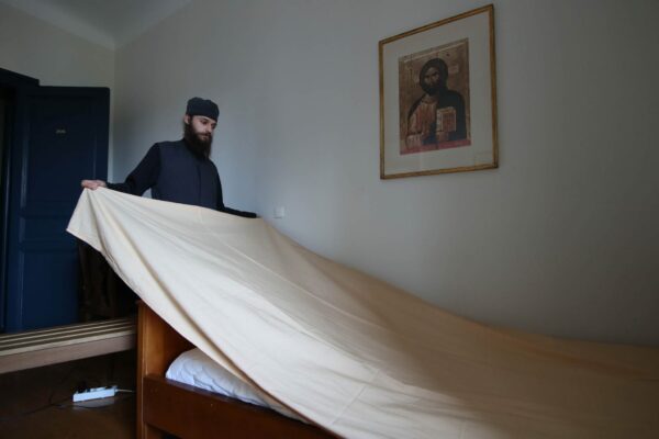 ΑΓΙΟΝ ΟΡΟΣ – Στα φωτογραφικά στιγμιότυπα, πατέρες της Βατοπαιδινής αδελφότητος, κατά την ώρα του διακονήματος στους ξενώνες των προσκυνήτων. Το άλλαγμα των σεντονιών και η αναγκαία καθαριότητα, ώστε όλα να είναι έτοιμα για τη φιλοξενία των εκατοντάδων ευλαβών επισκεπτών.