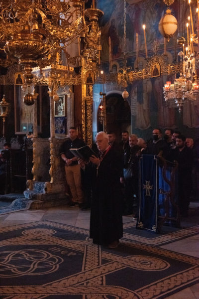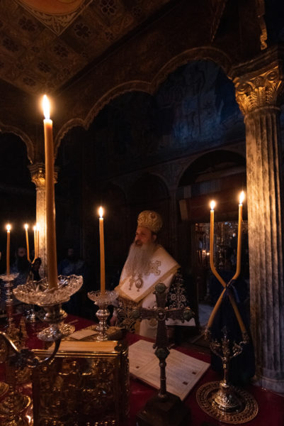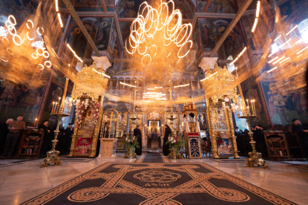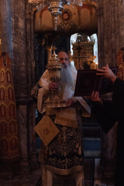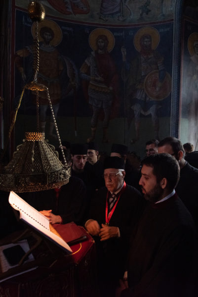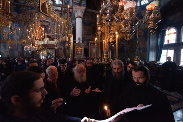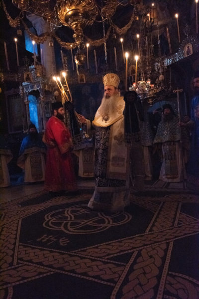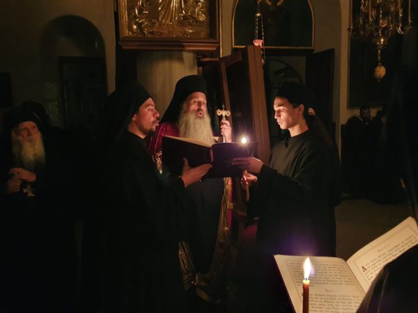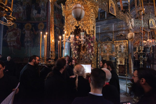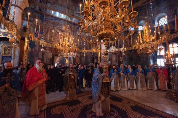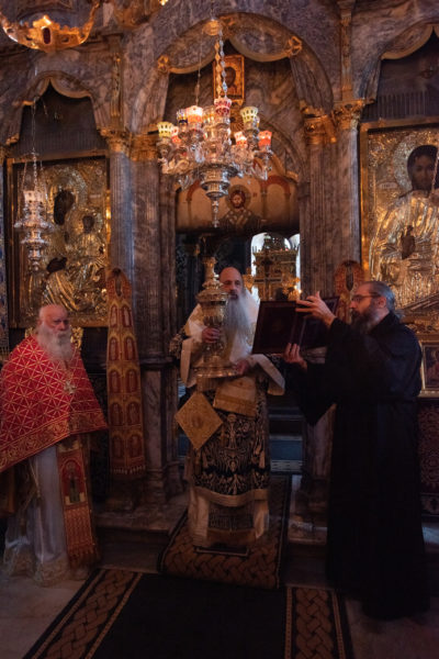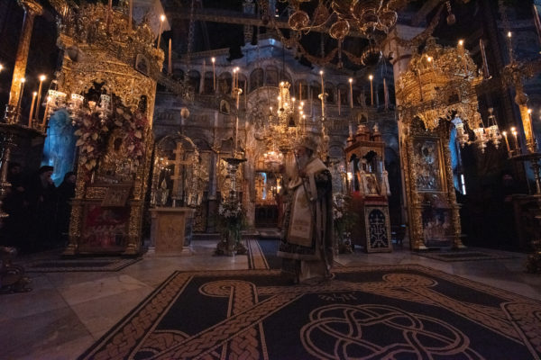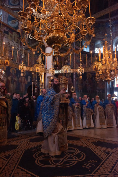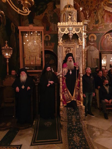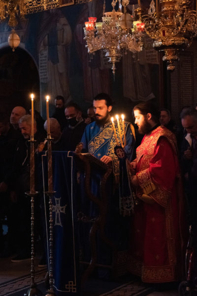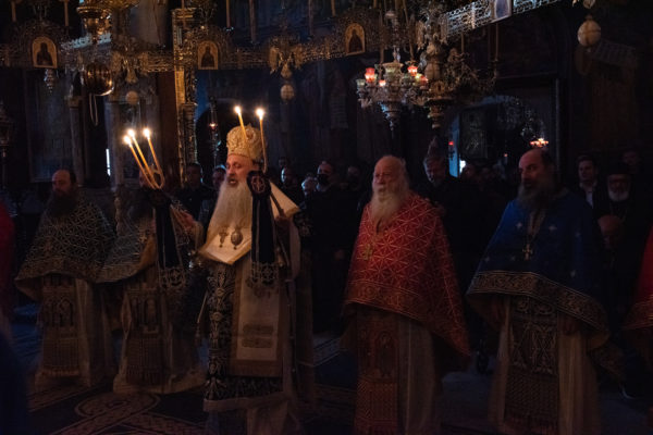 Εν συνεχεία, ετελέσθη η Ιερά Αγρυπνία σύμφωνα με το αθωνικό τυπικό, προεξάρχοντος του Σεβασμιωτάτου Μητροπολίτου Σταγών και Μετεώρων κ. Θεοκλήτου και με αθρόα συμμετοχή Ιερέων και Διακόνων. Στο δεξιό αναλόγιο διακόνησαν Βατοπαιδινοί Πατέρες και στο αριστερό ο Αρχων Πρωτοψάλτης της Μεγάλης του Χριστού Εκκλησίας κ. Φώτιος Γιαννακάκης.