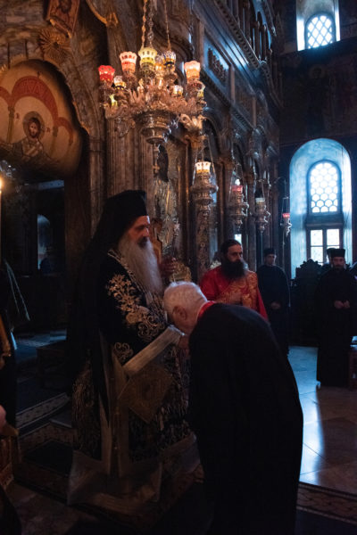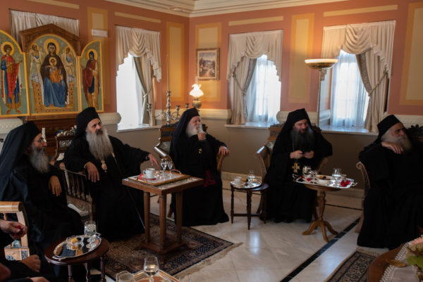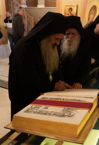 Ο Σεβασμιώτατος, πλαισιωμένος από τους Ηγουμένους των Ιερών Μονών των Αγίων Μετεώρων, Ιερείς, Ιεροδιακόνους και Μοναχούς, έγινε δεκτός με κάθε τιμή από τον Γέροντα Αλέξιο και την Συνοδεία του, σύμφωνα με το αγιορείτικο τυπικό.
