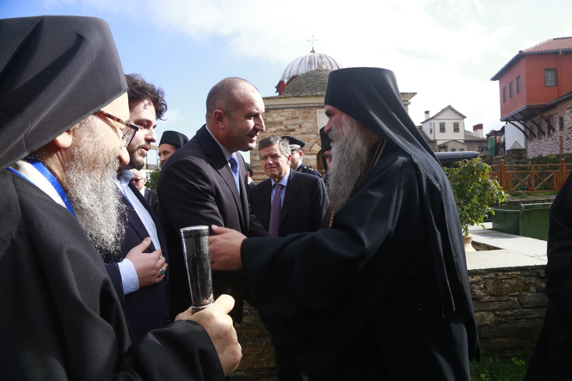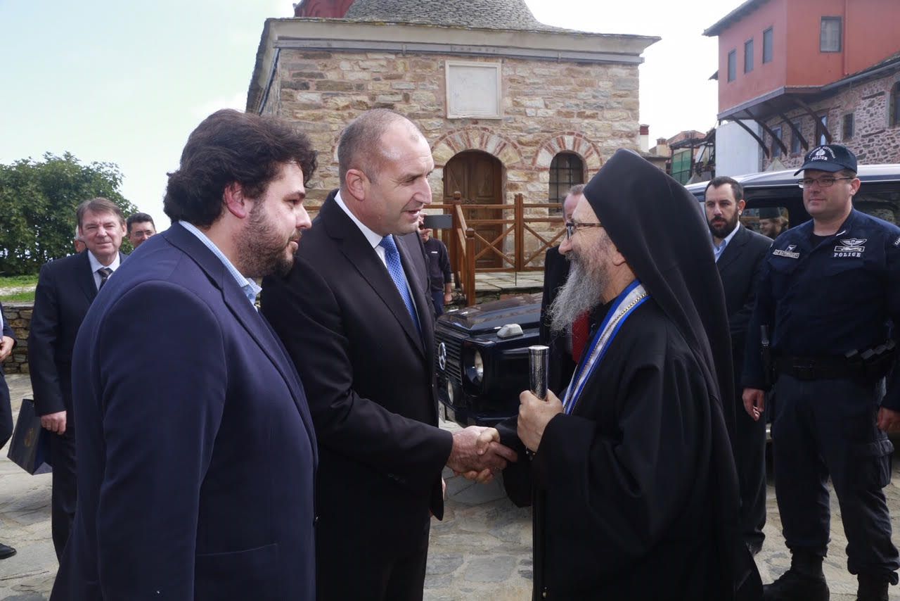 Μεγαλειώδους υποδοχής, με πανηγυρικές κωδωνοκρουσίες, έτυχε ο πρόεδρος της Βουλγαρίας κ.Ρούμεν Ράντεφ, κατά την άφιξή του στον Ιερό Ναό Πρωτάτου στις Καρυές του Αγίου Όρους, στο πλαίσιο του εορτασμού της Ανακομιδής λειψάνων του Αγίου Γεωργίου της Ιεράς Μονής Ζωγράφου , όπου εγκαταβιώνουν μοναχοί Βουλγαρικής καταγωγής.