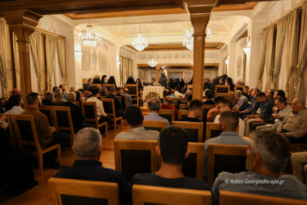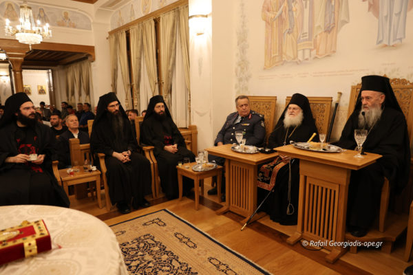 Κατά τη διάρκεια της Αγρυπνίας στο Συνοδικό της Μονής παρατέθηκε το καθιερωμένο αγιορείτικο κέρασμα. Ο Μητροπολίτης κ. Ιερόθεος και ο Καθηγούμενος Γέρων Εφραίμ απηύθυναν εόρτιους λόγους προς τους παρευρισκομένους πατέρες και προσκυνητές.