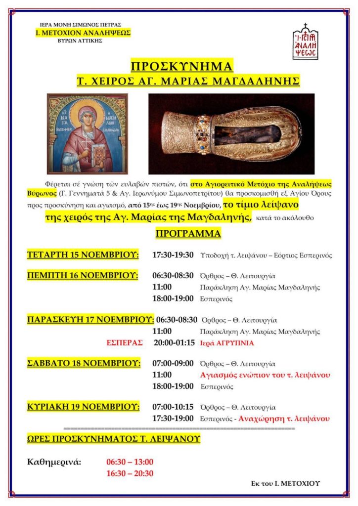 Φέρεται σέ γνώση τῶν ευλαβών πιστών, ότι στο Αγιορειτικό Μετόχιο της Αναλήψεως Βύρωνος (Γ. Γεννηματά 5 & Αγ. Ιερωνύμου Σιμωνοπετρίτου) θα προσκομισθή εξ Αγίου Όρους προς προσκύνηση και αγιασμό, από 15ης έως 19ης Νοεμβρίου, το τίμιο λείψανο της χειρός της Αγ. Μαρίας της Μαγδαληνής, κατά το ακόλουθο πρόγραμμα