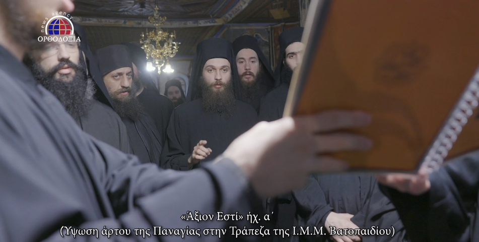 Βατοπαιδινοί πατέρες, ψάλλουν το “Άξιον Εστί” τελώντας την Ακολουθία που τελείται στην τράπεζα