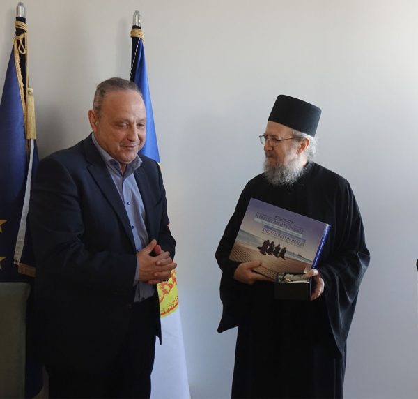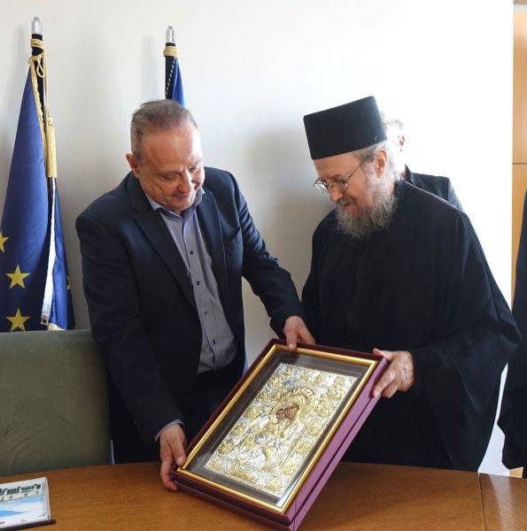 Ο Ιερομόναχος Ιερώνυμος Σιμωνοπετρίτης, μετέφερε στον Δήμαρχο τις ευχές σύσσωμης της Ιεράς Κοινότητας του Αγίου Όρους για μια καρποφόρα θητεία και του χάρισε αντίγραφο της Εφέστιας εικόνας του Ιερού Ναού του Πρωτάτου «Παναγίας του Άξιον Εστί».