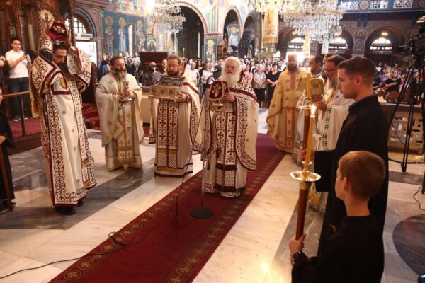 Του Όρθρου και της Θείας Λειτουργίας προεξήρχε ο Καθηγούμενος της Ιεράς Μεγίστης Μονής Βατοπαιδίου Γέροντας Εφραίμ με την συμμετοχή Βατοπαιδινών πατέρων και κληρικών της Ιεράς Μητροπόλεως Κορίνθου.
