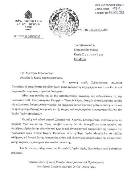 Επιστολή συμπαράστασης απέστειλε η Ιερά Κοινότητα του Αγίου Όρους προς τον Σεβασμιώτατο Μητροπολίτη Μάνης κ. Χρυσόστομο Γ’, με αφορμή τις καταστρεπτικές πυρκαγιές, που έπληξαν την περιοχή το προηγούμενο διάστημα.