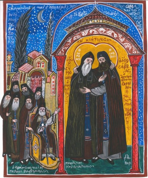 Μετά από ένα θαύμα της Παναγίας που ίασε το χέρι του Αγίου Ιωάννη του Δαμασκηνού, ο Άγιος αποφασίζει να γίνει μοναχός στη Λαύρα του Αγίου Σάββα του Ηγιασμένου στην Παλαιστίνη. Μαζί του είχε και την εικόνα της Παναγίας Τριχερούσας.