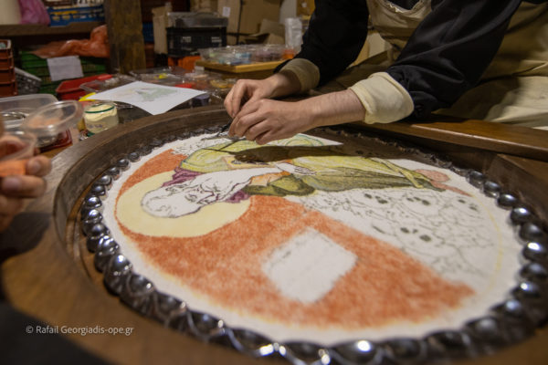 Για τις αγιογραφίες στην επιφάνεια του κόλλυβου παίρνουν την ξύλινη άκρη ψιλού πινέλου ζωγραφικής και πατούν το σχέδιο πάνω στη ζάχαρη από το ανθίβολο. Με τον τρόπο αυτό γεμίζουν τα ρούχα, το πρόσωπο, τα μαλλιά με ζάχαρη διαφόρων χρωμάτων.