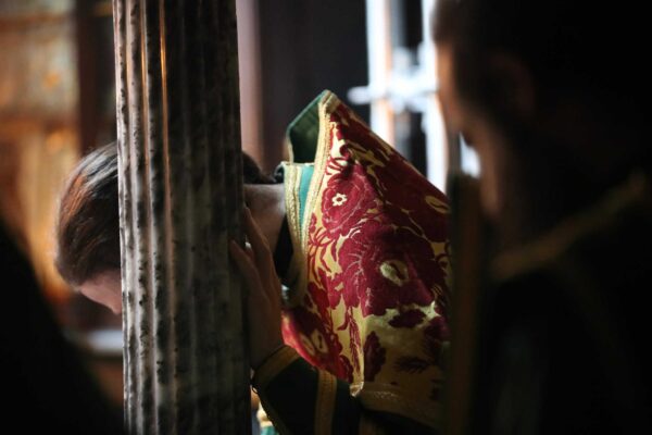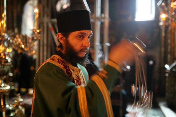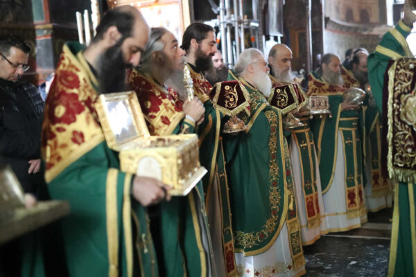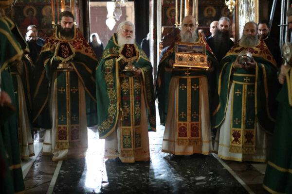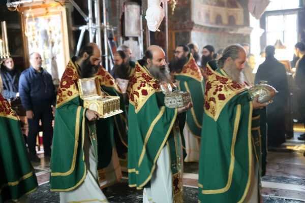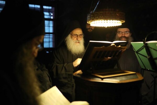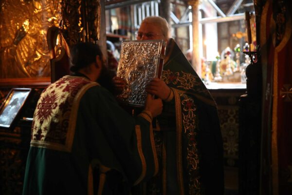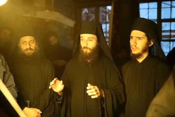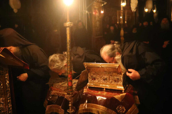 Της Ιεράς Αγρυπνίας και τελικώς της Θείας Λειτουργίας προέστη ο Καθηγούμενος της Ιεράς Μονής Αρχιμ. π. Εφραίμ, καθώς η πολυπληθής βατοπαιδινή συνοδία προσευχόνταν με ένταση και παρίσταντο καθόλη τη διάρκεια της νυχτός έως και τις πρώτες πρωινές ώρες.