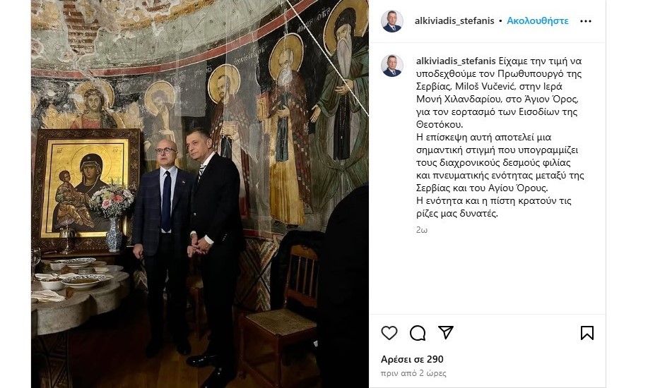“Είχαμε την τιμή να υποδεχθούμε τον Πρωθυπουργό της Σερβίας, Miloš Vučević, στην Ιερά Μονή Χιλανδαρίου, στο Άγιον Όρος, για τον εορτασμό των Εισοδίων της Θεοτόκου.