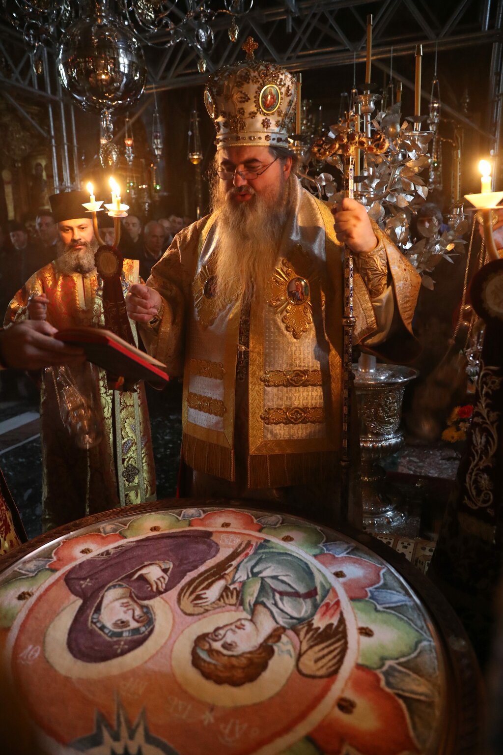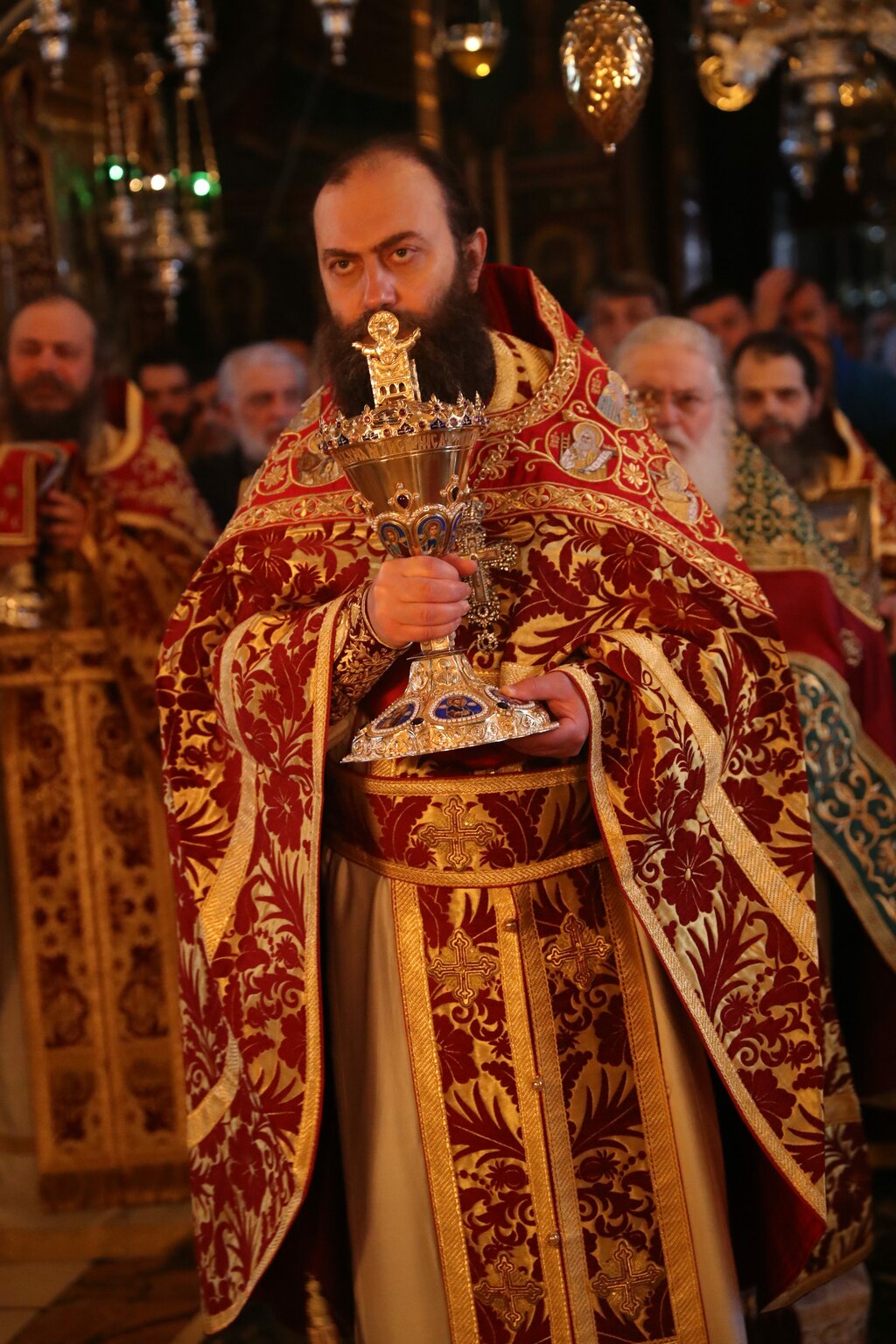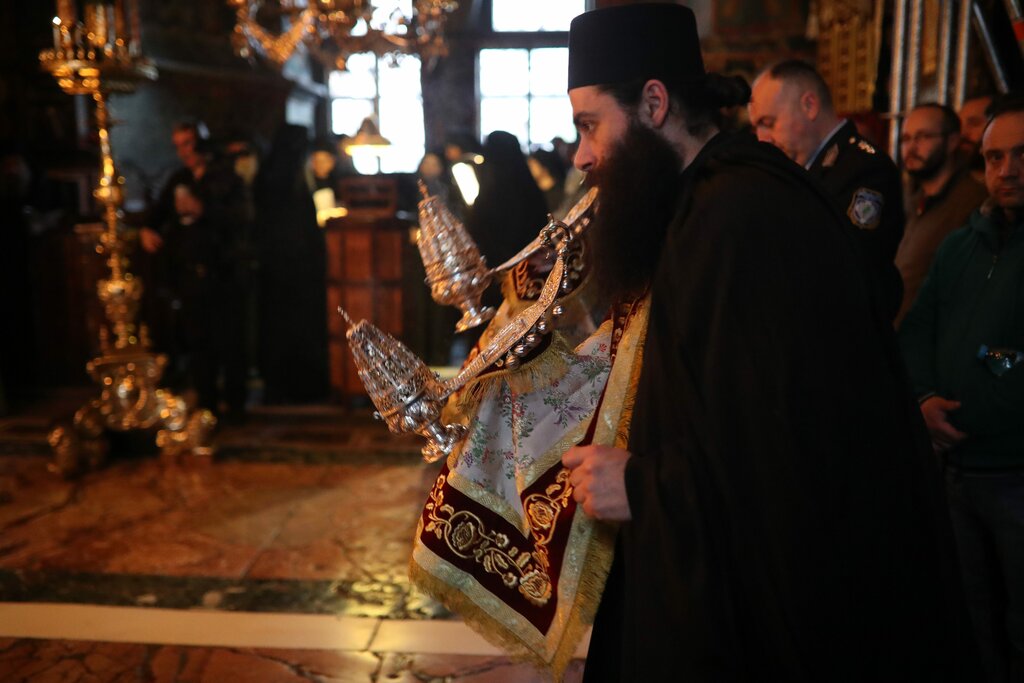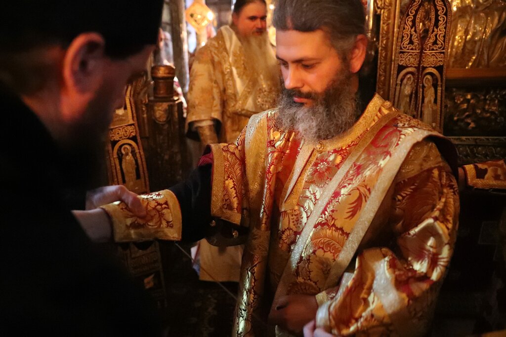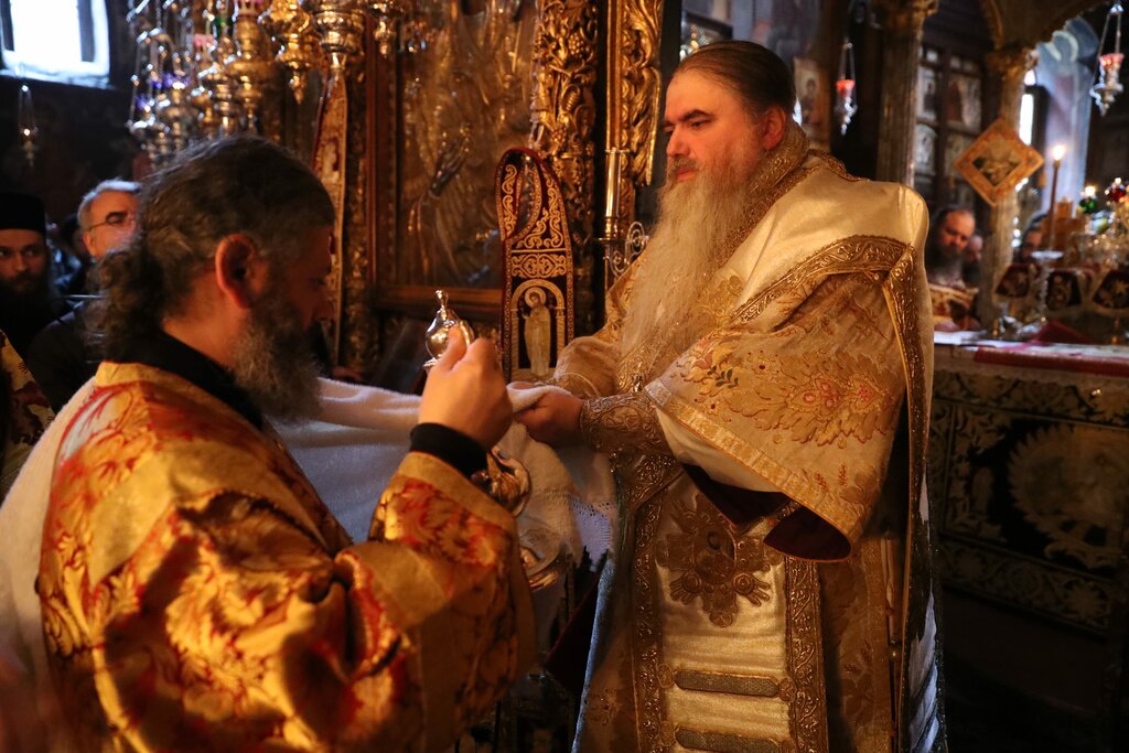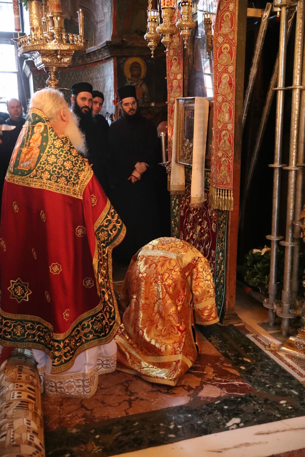 Στην ιερά αγρυπνία συμπροσευχήθηκαν ο Καθηγούμενος της Ιεράς Μονής Βατοπαιδίου Γέροντας Εφραίμ και ο Καθηγούμενος της Ιεράς Μονής Χιλανδαρίου Αρχιμανδρίτης Μεθόδιος, κατά το έθος, καθ’ ότι ο σύνδεσμος των δύο Μονών είναι άρρηκτος από της ιδρύσεώς τους. Κατά τη διάρκεια της Θείας Λειτουργίας ο Σεβασμιώτατος τέλεσε το μυστήριο της εις διάκονον χειροτονίας του αδελφού της Μονής Βατοπαιδίου πατρός Φιλοθέου. Ο Μητροπολίτης και οι δύο Ηγούμενοι, απηύθυναν λόγο στο συνοδικό και στην τράπεζα δι’ ολίγων για την εορτή του Ευαγγελισμού και το πρόσωπο της Παναγίας μας, αλλά και για τον Νεοφανή Σέρβο Άγιο της Εκκλησίας μας Ιουστίνο Πόποβιτς (του οποίου το όνομα φέρει ο Σεβασμιώτατος), καθ’ ότι σήμερα συμπληρώνονται 40 χρόνια από την κοίμηση και 125 από τη γέννηση του μεγάλου αυτού Θεολόγου της Εκκλησίας μας.