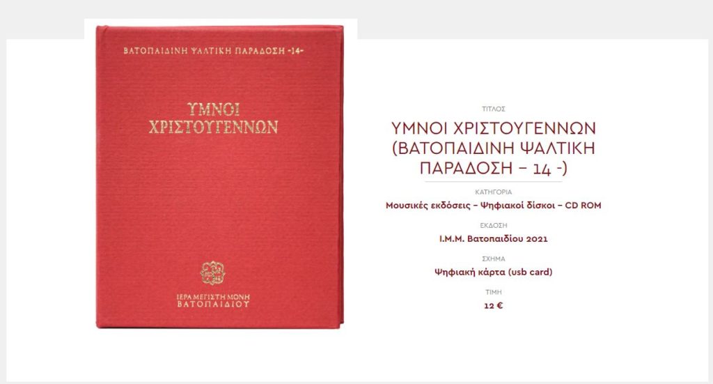 Η Ιερά Μεγίστη Μονή Βατοπαιδίου συνεχίζοντας την σειρά Βατοπαιδινή Ψαλτική Παράδοση επέλεξε, στον αριθμό 14, να περιληφθούν ύμνοι από την εορτή των Χριστουγέννων.