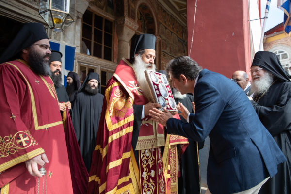 «Εξοχότατε κύριε υπουργέ, παρόντος του Σεβασμιωτάτου Μητροπολίτη Φθιώτιδος κ. Συμεών ο οποίος είναι προσκεκλημένος εις την πανήγυρη που είχαμε όλο το βράδυ για τους Βατοπαιδινούς Αγίου, σας υποδεχόμεθα για πρώτη φορά ως υφυπουργός Μακεδονίας Θράκης. Εμείς ξέρετε ότι σας αγαπούμε γιατί πρώτος εσείς ηγαπήσατε το Άγιον Όρος, πρώτος ερχόσαστε εδώ ως βουλευτής και ως μη βουλευτής, και πράγματι βλέπαμε πάντοτε στο πρόσωπό σας έναν άνθρωπο που επονούσε τον τόπο μας, επονούσε την Ελλάδα, για αυτό και πάντοτε εμείς είμαστε βέβαιοι ότι εσείς σε δύσκολες στιγμές θα κρατήσετε μία θέση πολύ σωστήν σύμφωνα με την παράδοση της Εκκλησίας. Εμείς, βέβαια, είμαστε στεναχωρημένοι, διότι ξέρετε για τα νομοθετικά τα οποία έχουν γίνει, και μερικοί την στάση μας και την θέση μας την εθεώρησαν ότι είναι μία πολιτική θέση. Κύριε υπουργέ εμείς δεν πολιτικολογούμε, δεν έχουμε παραστάσεις πολιτικές. Αλλά εμείς από έναν πόνο πνευματικό, πάντοτε μερικές φορές λέμε μία γνώμη , και αυτή η γνώμη πηγάζει από έναν μεγάλο πόνο και από έναν πόθο ότι η Ελλάδα μας πρέπει να συνεχίσει να είναι στραμμένη προς τις παραδόσεις».