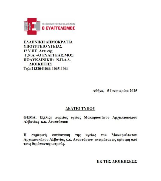 Σχετικά με την πορεία της υγείας του Αρχιεπισκόπου κ.κ. Αναστασίου έχουν εκδοθεί από το νοσοκομείο “Ευαγγελισμός” ΄δυο ιατρικά ανακοινωθέντα. Το πρώτο, το οποίο βγήκε το πρωί του Σαββάτου 4 Ιανουαρίου, ανέφερε: ““Ο Μακαριώτατος Αρχιεπίσκοπος Αλβανίας κ.κ. Αναστάσιος εισήχθη στις 3 Ιανουαρίου 2025, κατά τη γενική εφημερία του Νοσοκομείου ¨Ευαγγελισμός¨. Η κατάσταση της υγείας του, παρά το ήδη επιβαρυμένο ιατρικό ιστορικό του, κρίνεται σταθερή και παρακολουθείται στενά από την ιατρική ομάδα του Νοσοκομείου υπό την καθοδήγηση της Καθηγήτριας Πνευμονολογίας και Εντατικής Θεραπείας κας Αναστασίας Κοτανίδου. Ο Μακαριώτατος υποβάλλεται στις απαραίτητες ιατρικές εξετάσεις και λαμβάνει την ενδεδειγμένη φροντίδα”.