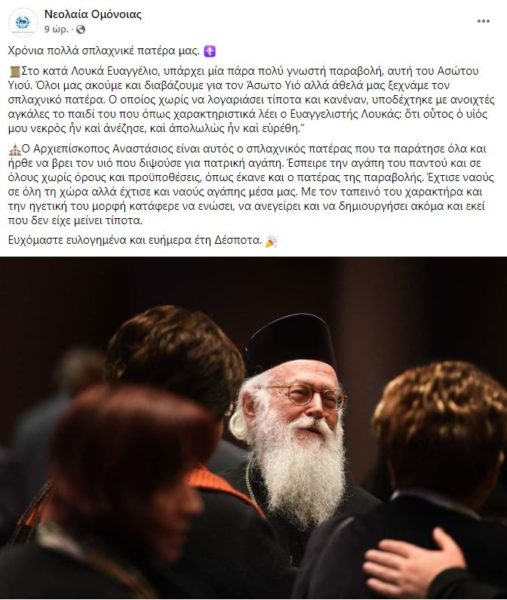 “Ο Αρχιεπίσκοπος Αναστάσιος είναι αυτός ο σπλαχνικός πατέρας που τα παράτησε όλα και ήρθε να βρει τον υιό που διψούσε για πατρική αγάπη”, αναφέρει στην ανάρτησή της η “Νεολαία της Ομόνοιας” καθώς ο Μακαριώτατος έσπειρε την αγάπη του παντού και σε όλους χωρίς όρους και προϋποθέσεις, όπως έκανε και ο πατέρας της παραβολής. ‘Έχτισε ναούς σε όλη τη χώρα αλλά έχτισε και ναούς αγάπης μέσα μας. Με τον ταπεινό του χαρακτήρα και την ηγετική του μορφή κατάφερε να ενώσει, να ανεγείρει και να δημιουργήσει ακόμα και εκεί που δεν είχε μείνει τίποτα. Ευχόμαστε ευλογημένα και ευήμερα έτη Δέσποτα”, καταλήγει.