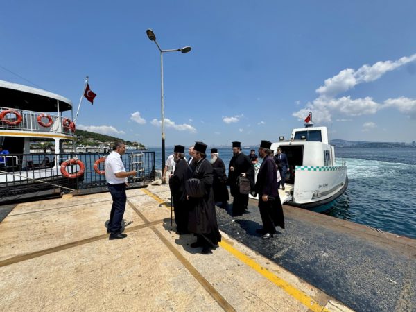 Ο Μακαριώτατος, ο οποίος κατά την μετάβασή του στην Χάλκη συνοδευόταν τιμητικώς από τον Σεβασμιώτατο Μητροπολίτη Κυδωνιών κ. Αθηναγόρα και τον Πανοσιολ. Κωδικογράφο της Αγίας και Ιεράς Συνόδου κ. Ευλόγιο, έγινε δεκτός στα προπύλαια από τον Καθηγούμενο, Θεοφιλέστατο Επίσκοπο Αραβισσού κ. Κασσιανό και την περί αυτόν αδελφότητα.