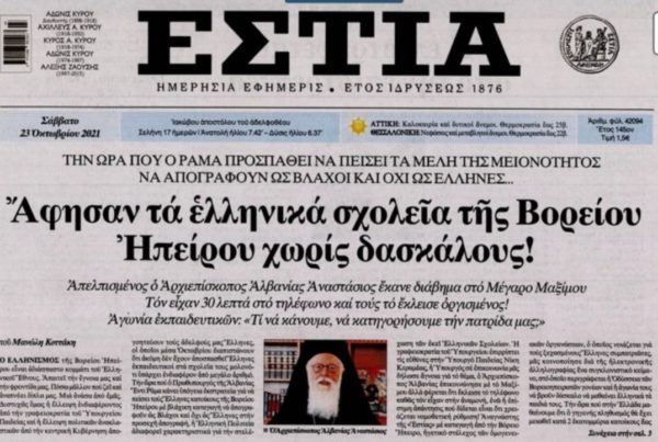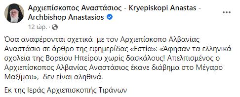 “Όσα αναφέρονται σχετικά με τον Αρχιεπίσκοπο Αλβανίας Αναστάσιο σε άρθρο της εφημερίδας «Εστία»: «Άφησαν τα ελληνικά σχολεία της Βορείου Ηπείρου χωρίς δασκάλους! Απελπισμένος ο Αρχιεπίσκοπος Αλβανίας Αναστάσιος έκανε διάβημα στο Μέγαρο Μαξίμου», δεν είναι αληθινά”, αναφέρει η σχετική ανακοίνωση της Ιεράς Αρχιεπισκοπή η οποία κοινοποιήθηκε και στα μέσα κοινωνικής δικτύωσης.