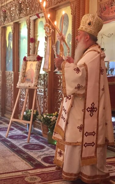 Της ακολουθίας του Όρθρου και της Θείας Λειτουργίας που τελέστηκε προεξήρχε ο Μητροπολίτης Αμαντίας κ. Ναθαναήλ, ενώ ακολούθησε και περιφορά της Ιεράς εικόνας πέριξ του ναού.