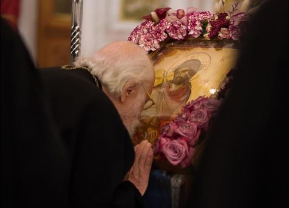 Μετά την απόλυση της ακολουθίας ο Μακαριώτατος προσκύνησε την εικόνα του Νυμφίου που είναι τοποθετημένη στο μέσο του Καθεδρικού Ναού.